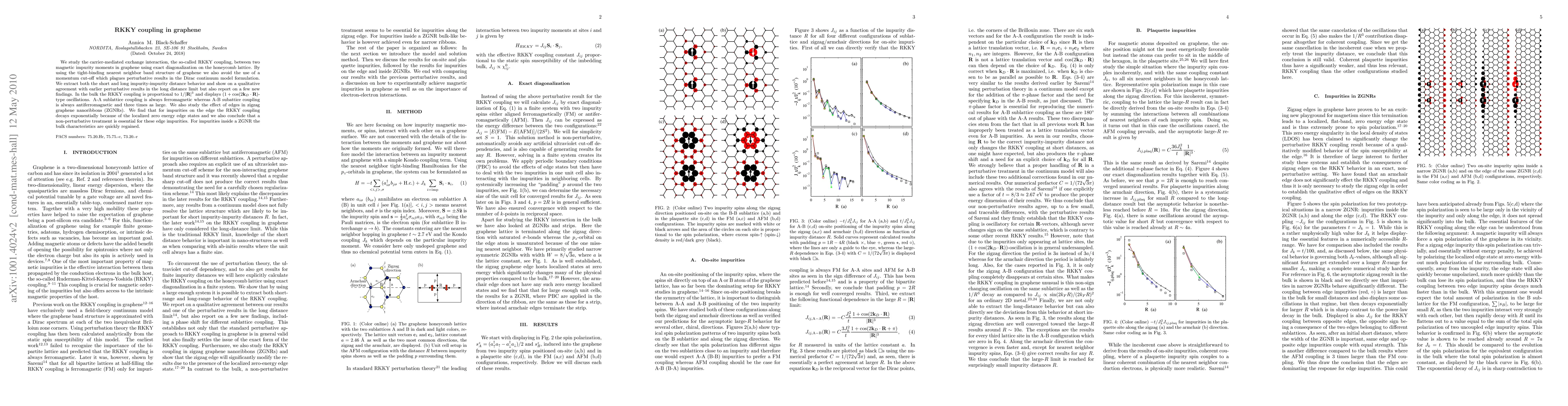 This paper investigates the RKKY coupling in graphene using exact diagonalization, revealing that the interaction between magnetic moments is proportional to $1/|{\bf R}|^3$ with oscillatory behavior, and is dependent on the sublattice coupling. Edge effects in zigzag graphene nanoribbons cause exponential decay of RKKY coupling due to localized edge states.