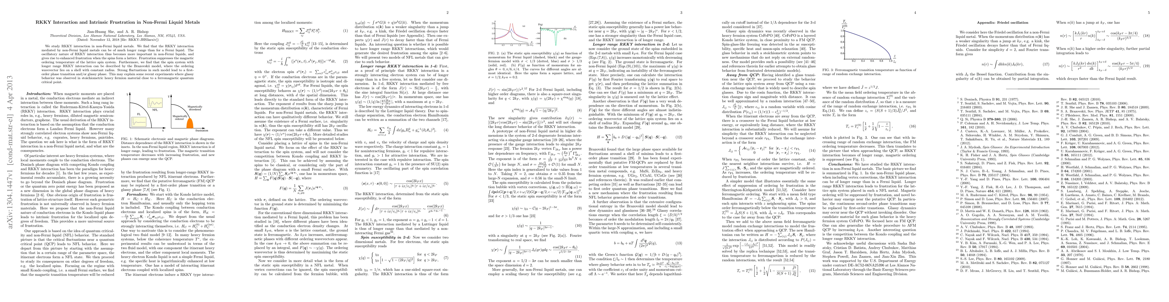 We study RKKY interaction in non-Fermi liquid metals. We find that the RKKY interaction mediated by non-Fermi liquid metals can be of much longer range than for a Fermi liquid. The oscillatory nature of RKKY interaction thus becomes more important in non-Fermi liquids, and gives rise to enhanced frustration when the spins form a lattice. Frustration suppresses the magnetic ordering temperature of the lattice spin system. Furthermore, we find that the spin system with longer range RKKY interaction can be described by the Brazovskii model, where the ordering wavevector lies on a shell with constant radius. Strong fluctuations in such model lead to a first-order phase transition and/or glassy phase. This may explain some recent experiments where glassy behavior was observed in stoichiometric heavy fermion material close to a ferromagnetic quantum critical point.