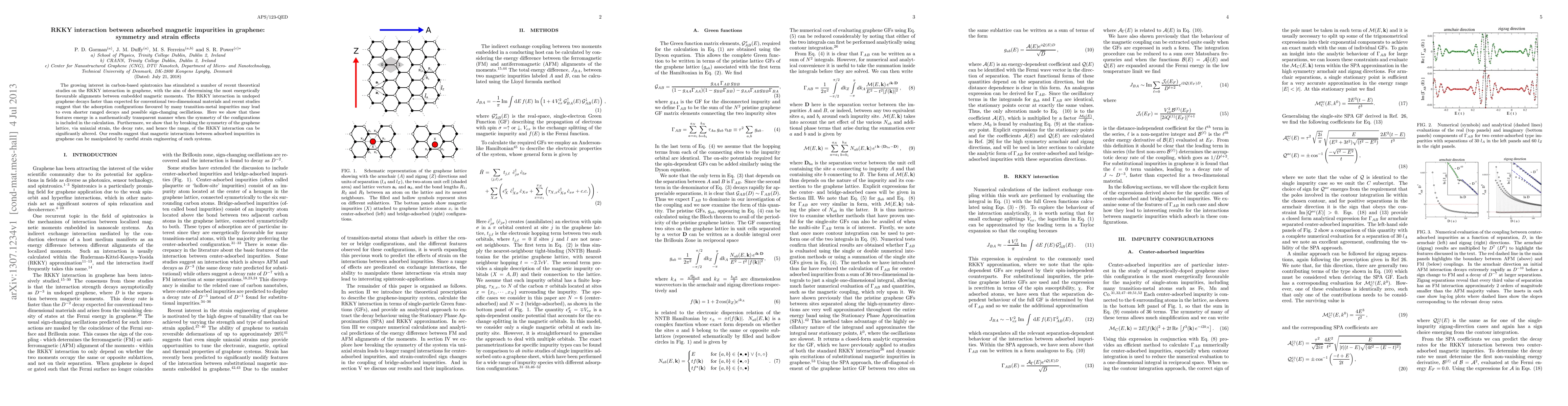 This paper investigates the RKKY interaction between magnetic impurities in graphene, demonstrating that symmetry and strain significantly affect its decay rate. Uniaxial strain can manipulate the range of magnetic interactions, suggesting potential for strain engineering in spintronic applications.