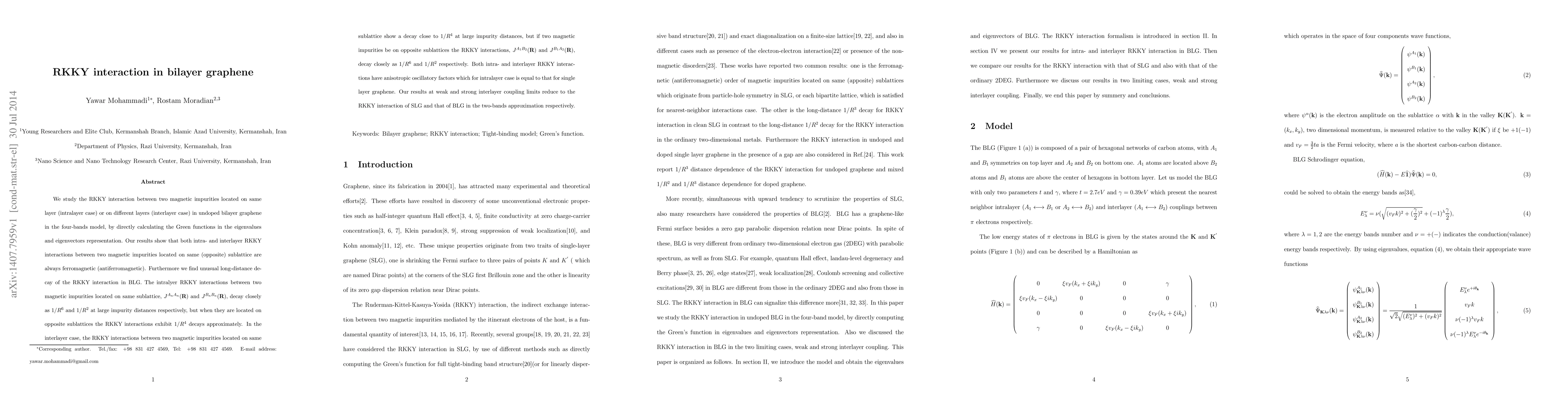 This research investigates the RKKY interaction in undoped bilayer graphene for intralayer and interlayer magnetic impurities using a four-bands model, revealing ferromagnetic intralayer and antiferromagnetic interlayer interactions. The study finds unusual long-distance decay behaviors for the RKKY interactions, notably $1/R^{6}$, $1/R^{2}$, and $1/R^{4}$ decays depending on impurity locations and sublattices.