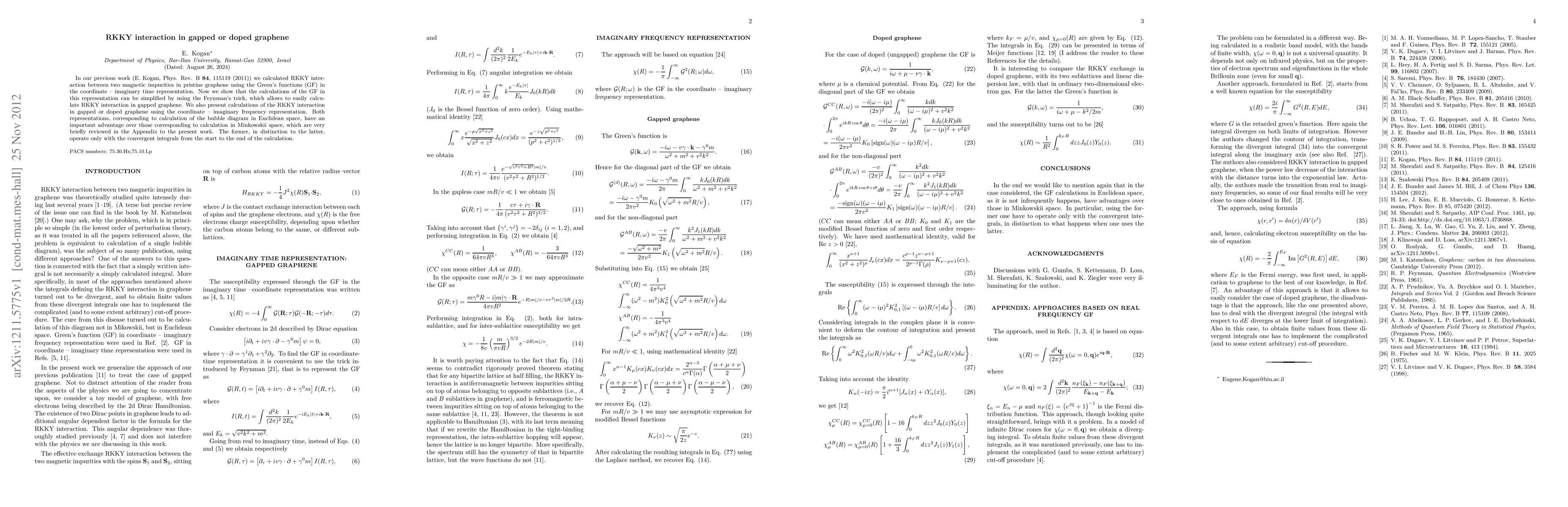 In our previous work (E. Kogan, Phys. Rev. B {\bf 84}, 115119 (2011)) we calculated RKKY interaction between two magnetic impurities in pristine graphene using the Green's functions (GF) in the coordinate -- imaginary time representation. Now we show that the calculations of the GF in this representation can be simplified by using the Feynman's trick, which allows to easily calculate RKKY interaction in gapped graphene. We also present calculations of the RKKY interaction in gapped or doped graphene using the coordinate -- imaginary frequency representation. Both representations, corresponding to calculation of the bubble diagram in Euclidean space, have an important advantage over those corresponding to calculation in Minkowskii space, which are very briefly reviewed in the Appendix to the present work. The former, in distinction to the latter, operate only with the convergent integrals from the start to the end of the calculation.