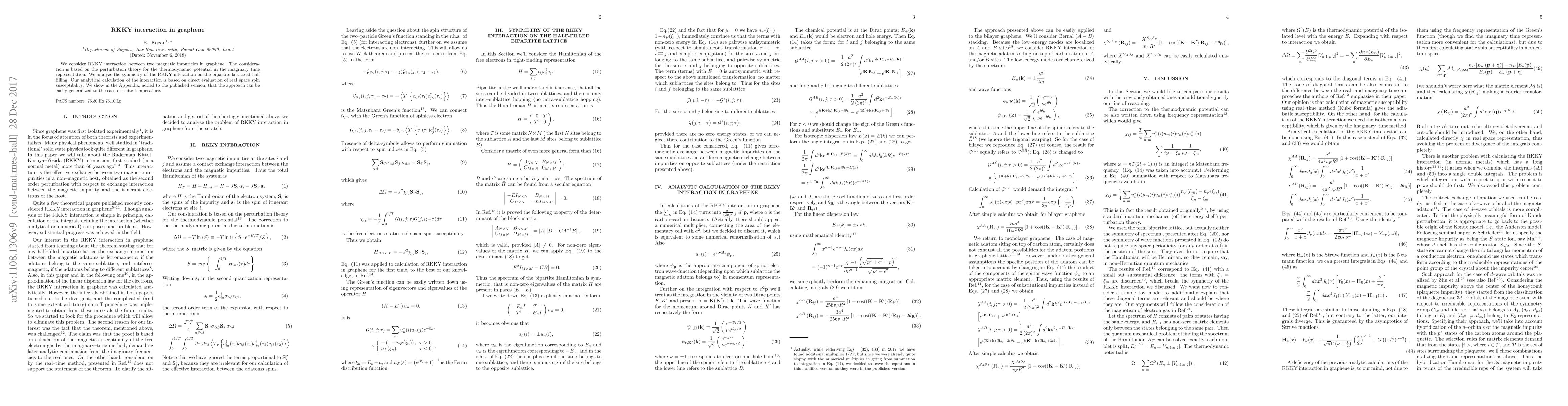 Summary: This paper investigates the RKKY interaction between two magnetic impurities in graphene using perturbation theory, revealing the symmetry of the interaction on a bipartite lattice at half filling and demonstrating analytical methods to evaluate the real space spin susceptibility, with potential for generalization to finite temperatures.