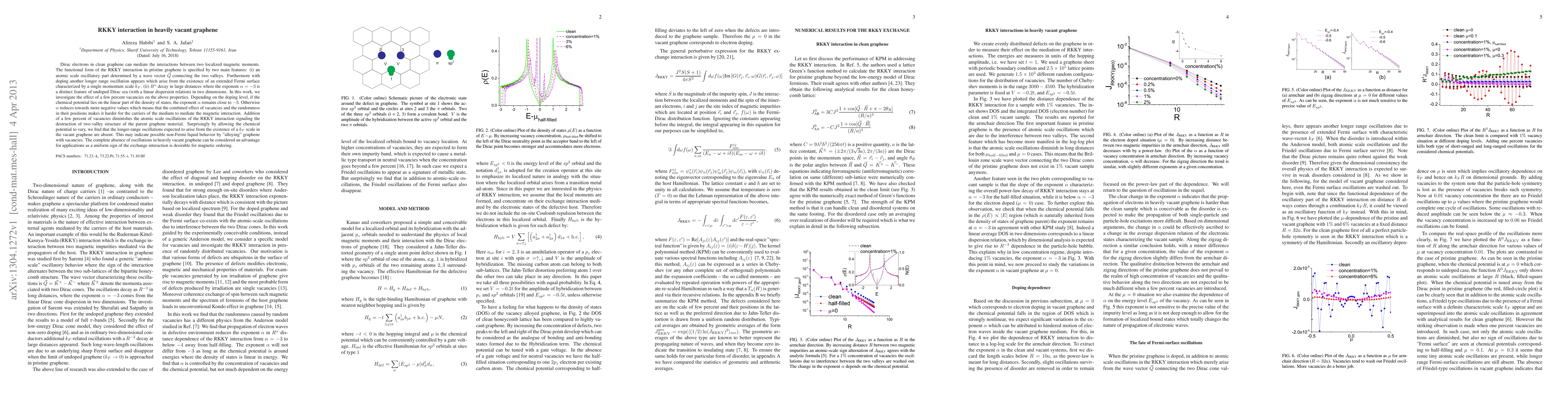 Dirac electrons in clean graphene can mediate the interactions between two localized magnetic moments. The functional form of the RKKY interaction in pristine graphene is specified by two main features: (i) an atomic scale oscillatory part determined by a wave vector $\vec Q$ connecting the two valleys. Furthermore with doping another longer range oscillation appears which arise from the existence of an extended Fermi surface characterized by a single momentum scale $k_F$. (ii) $R^{\alpha}$ decay in large distances where the exponent $\alpha=-3$ is a distinct feature of undoped Dirac sea (with a linear dispersion relation) in two dimensions. In this work, we investigate the effect of a few percent vacancies on the above properties. Depending on the doping level, if the chemical potential lies on the linear part of the density of states, the exponent $\alpha$ remains close to -3. Otherwise $\alpha$ reduces towards more negative values which means that the combined effect of vacancies and the randomness in their positions makes it harder for the carriers of the medium to mediate the magnetic interaction. Addition of a few percent of vacancies diminishes the atomic scale oscillations of the RKKY interaction signaling the destruction of two-valley structure of the parent graphene material. Surprisingly by allowing the chemical potential to vary, we find that the longer-range oscillations expected to arise from the existence of a $k_F$ scale in the vacant graphene are absent. This may indicate possible non-Fermi liquid behavior by "alloying" graphene with vacancies. The complete absence of oscillations in heavily vacant graphene can be considered an advantage for applications as a uniform sign of the exchange interaction is desirable for magnetic ordering.