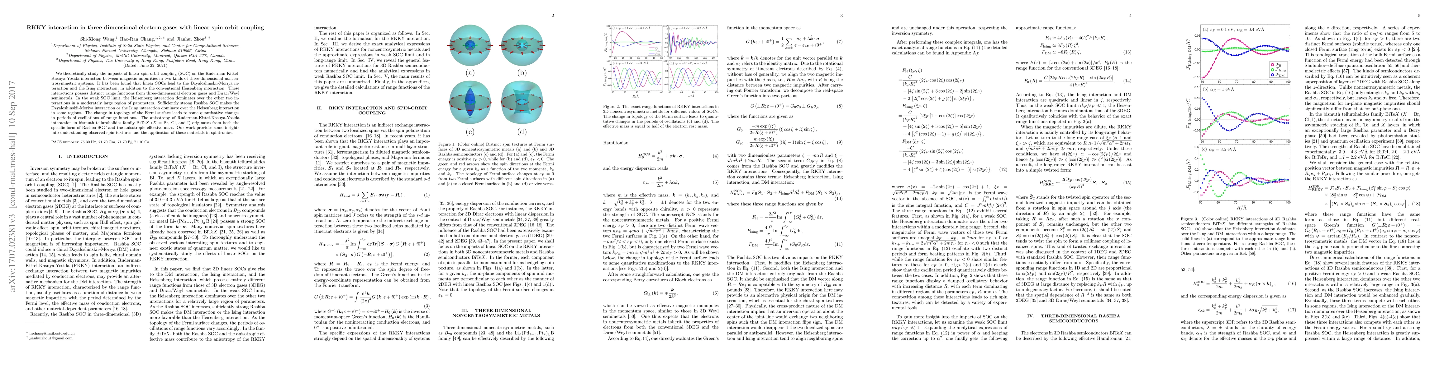 This paper investigates the Ruderman-Kittel-Kasuya-Yosida interaction in three-dimensional electron gases with linear spin-orbit coupling, revealing that it leads to Dzyaloshinskii-Moriya and Ising interactions alongside the conventional Heisenberg interaction, with distinct range functions. The study highlights the influence of spin-orbit coupling strength on these interactions and provides insights into the spin textures and potential spintronics applications in bismuth tellurohalides.
