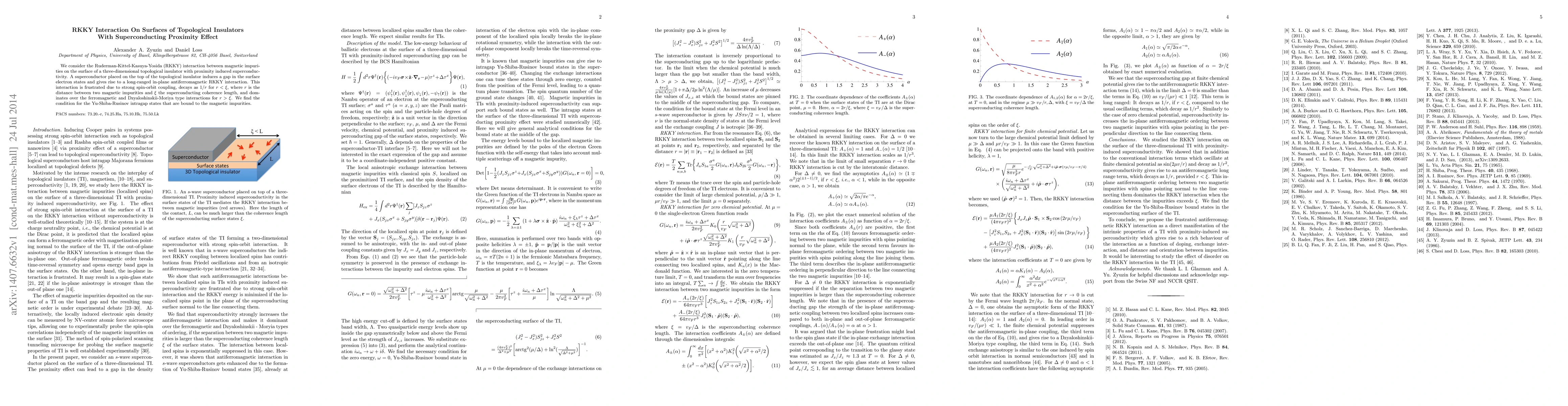 Researchers explored the RKKY interaction between magnetic impurities on topological insulators with induced superconductivity, finding a strong antiferromagnetic interaction that dominates over other interactions for certain distances.