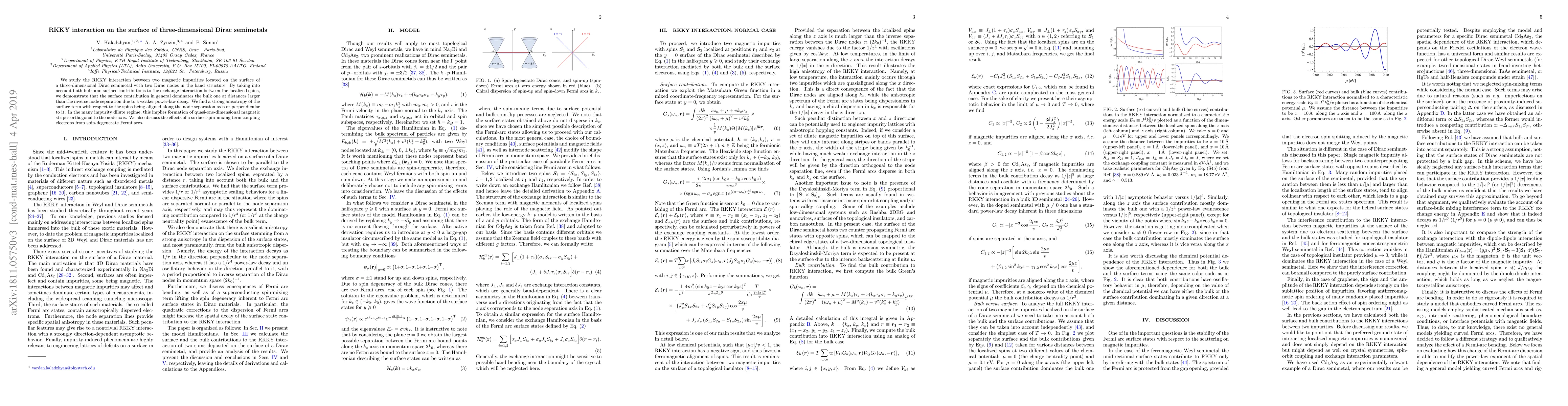 Researchers study the interaction between magnetic impurities on the surface of 3D Dirac semimetals, finding that the surface contribution to exchange interaction dominates at large distances and leads to anisotropic magnetic stripes.