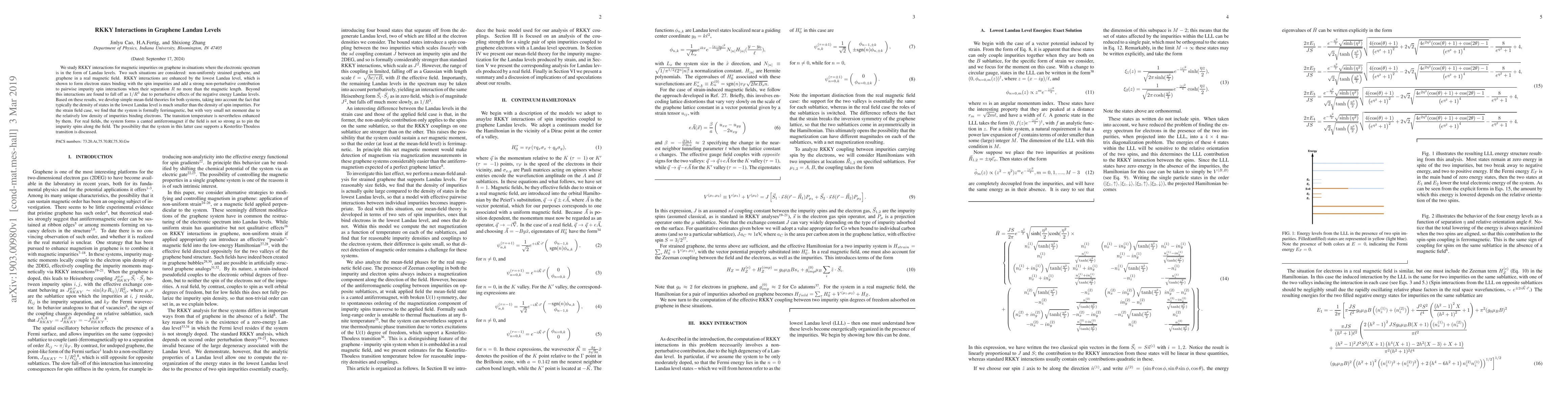 This paper investigates RKKY interactions in graphene under Landau level conditions, showing that the lowest Landau level enhances these interactions, leading to a strong non-perturbative contribution when impurity separations are small. The study develops mean-field theories for both strained and real magnetic field scenarios, revealing ferrimagnetic behavior in strained graphene and canted antiferromagnetism in real magnetic fields, with potential Kosterlitz-Thouless transitions.