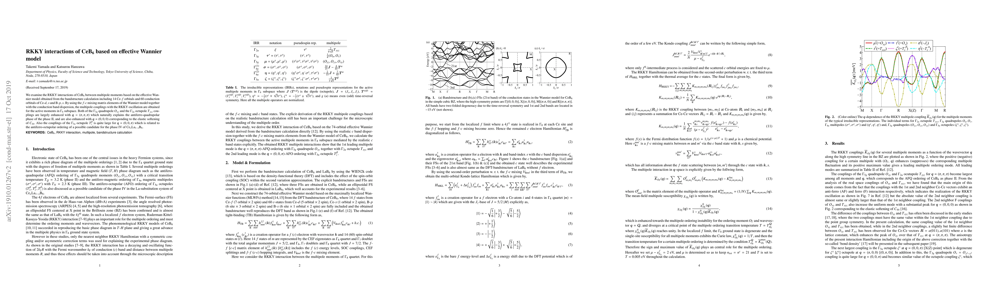 Researchers studied the RKKY interactions in CeB6 using an effective Wannier model, finding enhanced multipole couplings at specific wavevectors that explain antiferro-quadrupolar and octupolar phases.