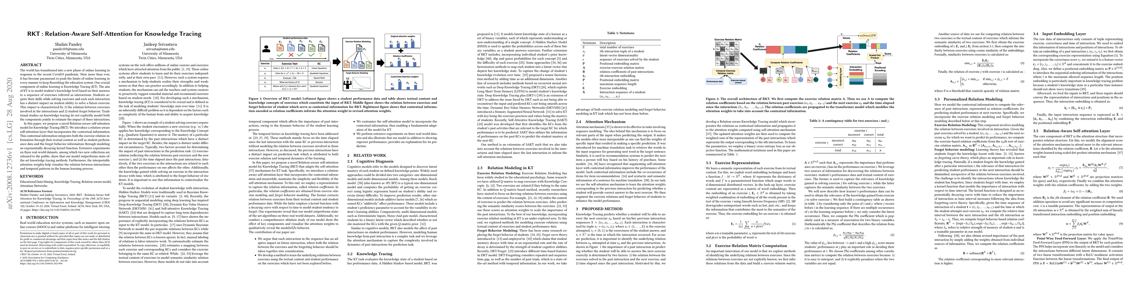 This paper proposes a novel Relation-aware Self-Attention model for Knowledge Tracing (RKT) that jointly models exercise relations and student forget behavior to improve the accuracy of student knowledge level estimation. The model's self-attention layer incorporates contextual information and outperforms existing methods, as demonstrated by experiments on three datasets.