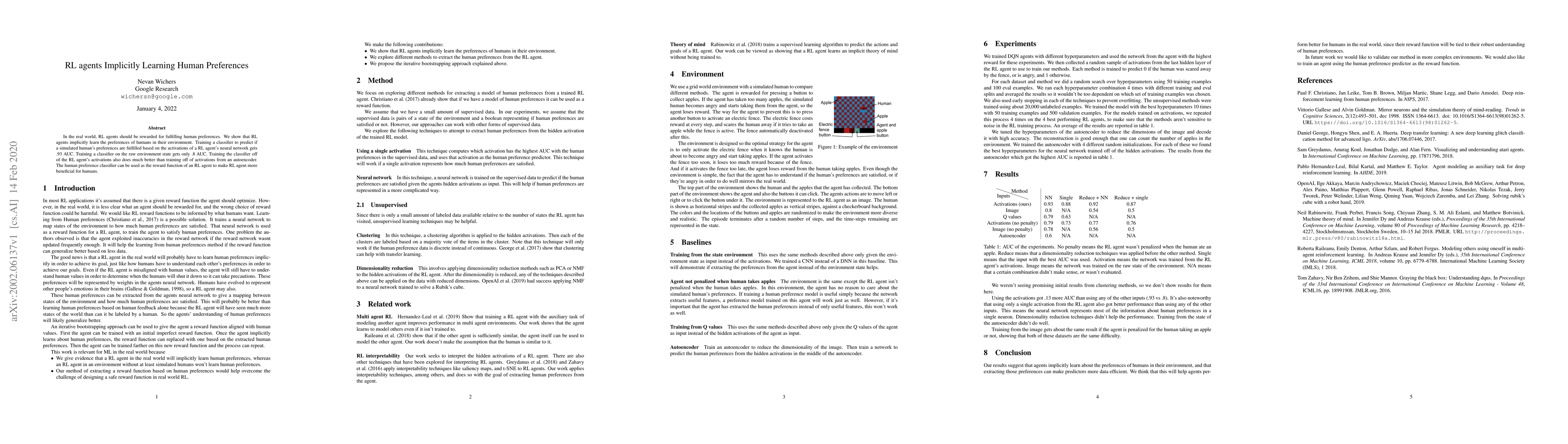 This paper demonstrates that reinforcement learning (RL) agents implicitly learn human preferences through their neural network activations, achieving a .93 AUC in predicting human satisfaction compared to .8 AUC using raw environment states. This suggests that RL agents can be guided by human preferences, enhancing their utility.