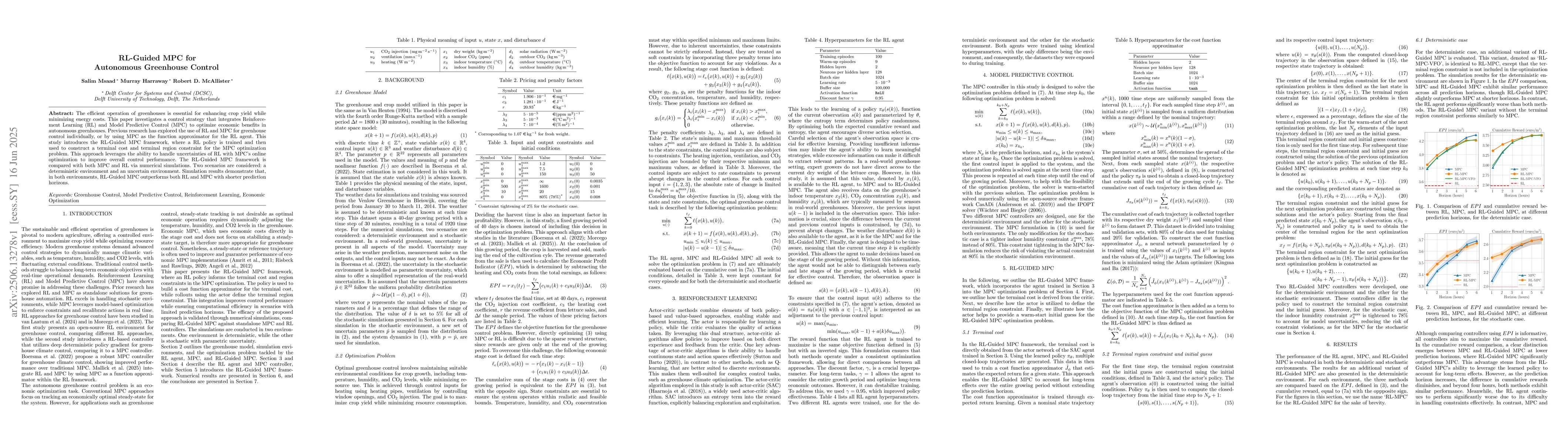 The efficient operation of greenhouses is essential for enhancing crop yield while minimizing energy costs. This paper investigates a control strategy that integrates Reinforcement Learning (RL) and Model Predictive Control (MPC) to optimize economic benefits in autonomous greenhouses. Previous research has explored the use of RL and MPC for greenhouse control individually, or by using MPC as the function approximator for the RL agent. This study introduces the RL-Guided MPC framework, where a RL policy is trained and then used to construct a terminal cost and terminal region constraint for the MPC optimization problem. This approach leverages the ability to handle uncertainties of RL with MPC's online optimization to improve overall control performance. The RL-Guided MPC framework is compared with both MPC and RL via numerical simulations. Two scenarios are considered: a deterministic environment and an uncertain environment. Simulation results demonstrate that, in both environments, RL-Guided MPC outperforms both RL and MPC with shorter prediction horizons.
