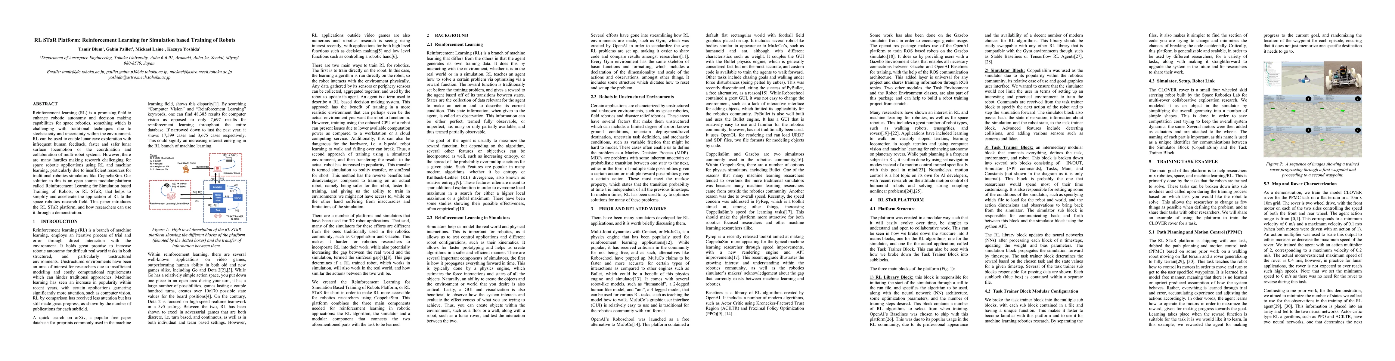 The RL STaR platform leverages reinforcement learning to enhance robotic autonomy for space applications, addressing challenges posed by environmental uncertainty. This open-source modular platform aims to simplify and accelerate RL application in space robotics, offering a solution to resource limitations faced by traditional simulators.