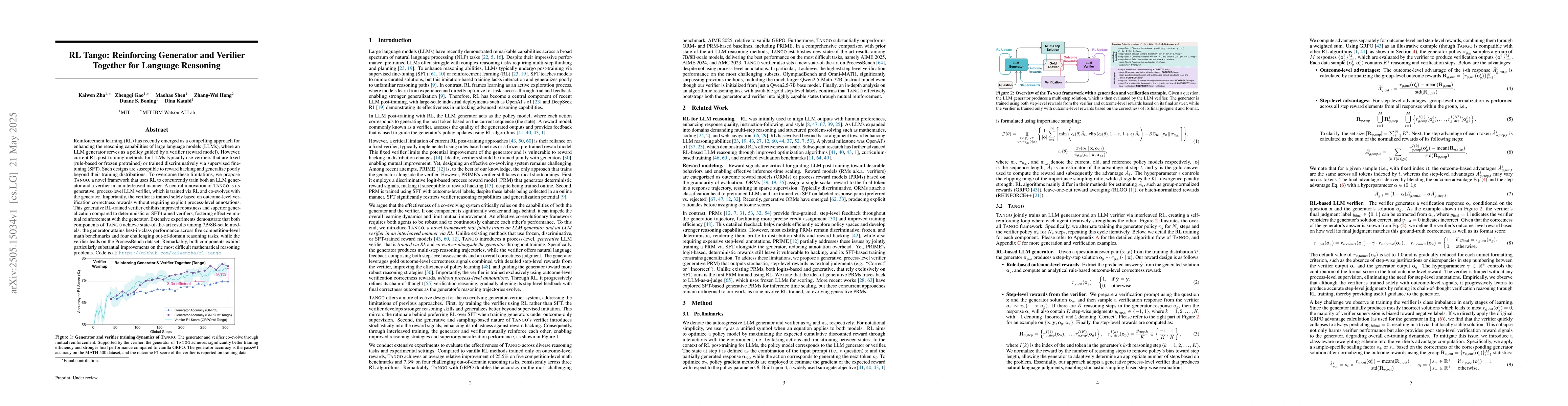 Tango introduces a novel framework for concurrently training an LLM generator and a generative RL-trained verifier, enhancing language reasoning capabilities without relying on fixed or discriminatively trained verifiers.