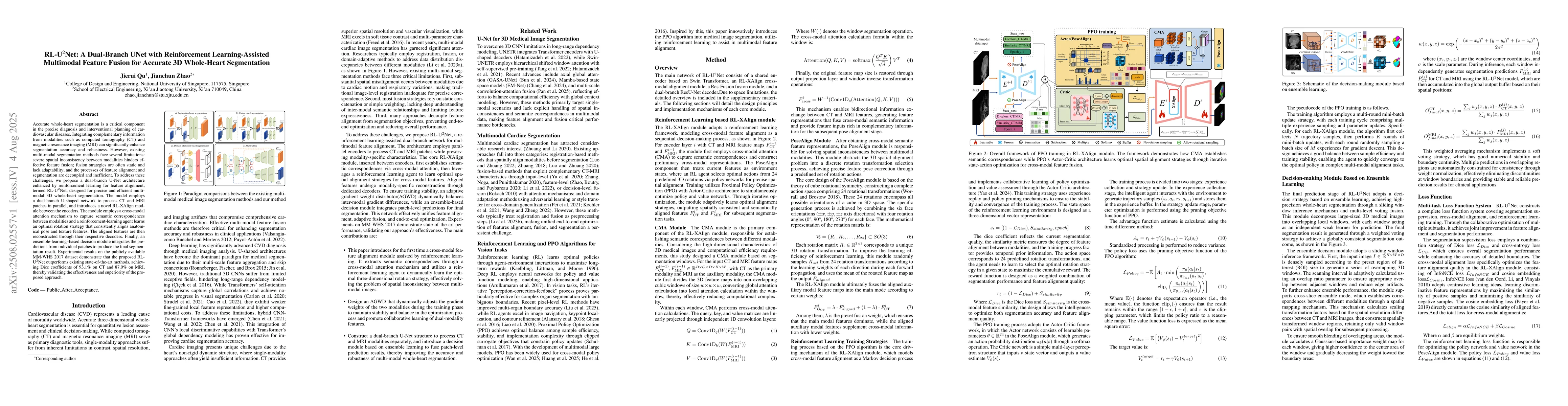 Accurate whole-heart segmentation is a critical component in the precise diagnosis and interventional planning of cardiovascular diseases. Integrating complementary information from modalities such as computed tomography (CT) and magnetic resonance imaging (MRI) can significantly enhance segmentation accuracy and robustness. However, existing multi-modal segmentation methods face several limitations: severe spatial inconsistency between modalities hinders effective feature fusion; fusion strategies are often static and lack adaptability; and the processes of feature alignment and segmentation are decoupled and inefficient. To address these challenges, we propose a dual-branch U-Net architecture enhanced by reinforcement learning for feature alignment, termed RL-U$^2$Net, designed for precise and efficient multi-modal 3D whole-heart segmentation. The model employs a dual-branch U-shaped network to process CT and MRI patches in parallel, and introduces a novel RL-XAlign module between the encoders. The module employs a cross-modal attention mechanism to capture semantic correspondences between modalities and a reinforcement-learning agent learns an optimal rotation strategy that consistently aligns anatomical pose and texture features. The aligned features are then reconstructed through their respective decoders. Finally, an ensemble-learning-based decision module integrates the predictions from individual patches to produce the final segmentation result. Experimental results on the publicly available MM-WHS 2017 dataset demonstrate that the proposed RL-U$^2$Net outperforms existing state-of-the-art methods, achieving Dice coefficients of 93.1% on CT and 87.0% on MRI, thereby validating the effectiveness and superiority of the proposed approach.