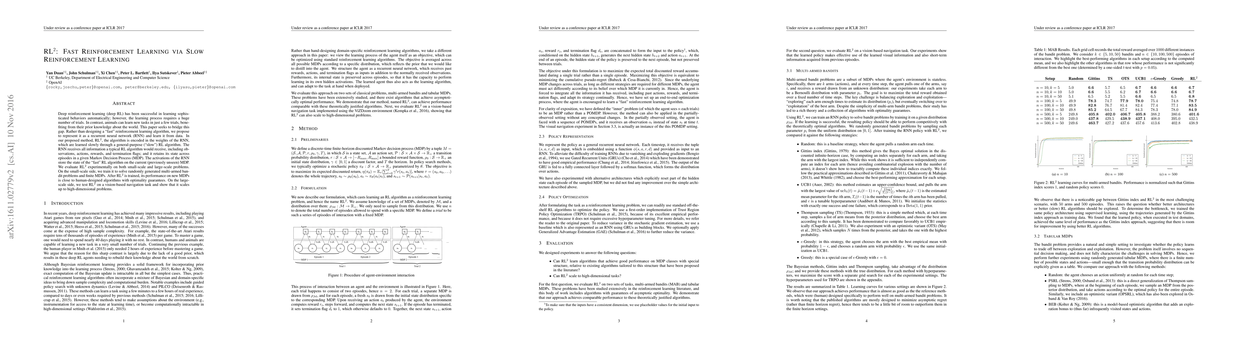 Deep reinforcement learning (deep RL) has been successful in learning sophisticated behaviors automatically; however, the learning process requires a huge number of trials. In contrast, animals can learn new tasks in just a few trials, benefiting from their prior knowledge about the world. This paper seeks to bridge this gap. Rather than designing a "fast" reinforcement learning algorithm, we propose to represent it as a recurrent neural network (RNN) and learn it from data. In our proposed method, RL$^2$, the algorithm is encoded in the weights of the RNN, which are learned slowly through a general-purpose ("slow") RL algorithm. The RNN receives all information a typical RL algorithm would receive, including observations, actions, rewards, and termination flags; and it retains its state across episodes in a given Markov Decision Process (MDP). The activations of the RNN store the state of the "fast" RL algorithm on the current (previously unseen) MDP. We evaluate RL$^2$ experimentally on both small-scale and large-scale problems. On the small-scale side, we train it to solve randomly generated multi-arm bandit problems and finite MDPs. After RL$^2$ is trained, its performance on new MDPs is close to human-designed algorithms with optimality guarantees. On the large-scale side, we test RL$^2$ on a vision-based navigation task and show that it scales up to high-dimensional problems.