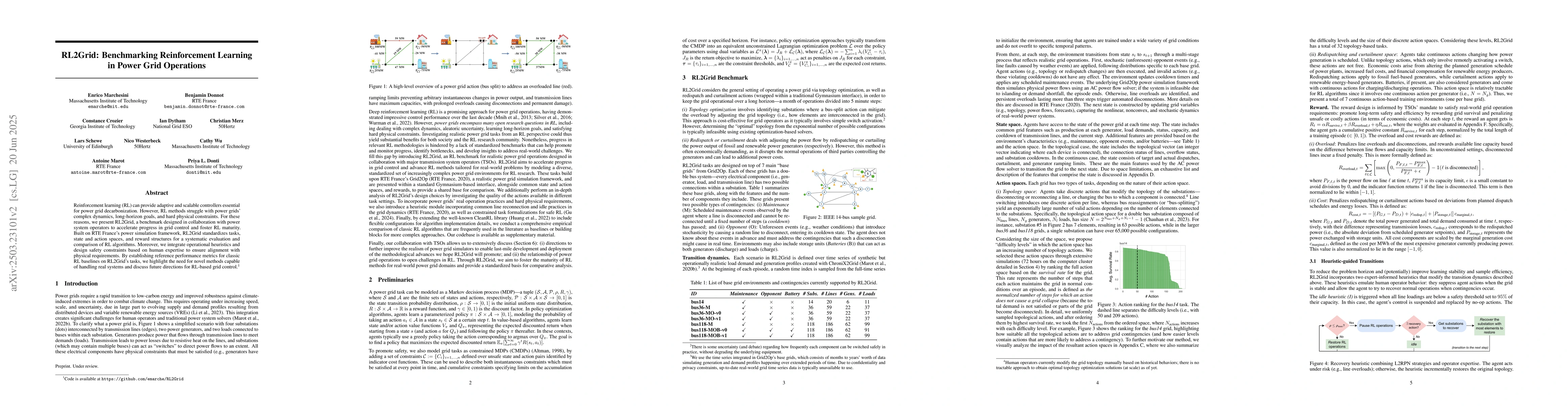 Reinforcement learning (RL) can provide adaptive and scalable controllers essential for power grid decarbonization. However, RL methods struggle with power grids' complex dynamics, long-horizon goals, and hard physical constraints. For these reasons, we present RL2Grid, a benchmark designed in collaboration with power system operators to accelerate progress in grid control and foster RL maturity. Built on RTE France's power simulation framework, RL2Grid standardizes tasks, state and action spaces, and reward structures for a systematic evaluation and comparison of RL algorithms. Moreover, we integrate operational heuristics and design safety constraints based on human expertise to ensure alignment with physical requirements. By establishing reference performance metrics for classic RL baselines on RL2Grid's tasks, we highlight the need for novel methods capable of handling real systems and discuss future directions for RL-based grid control.