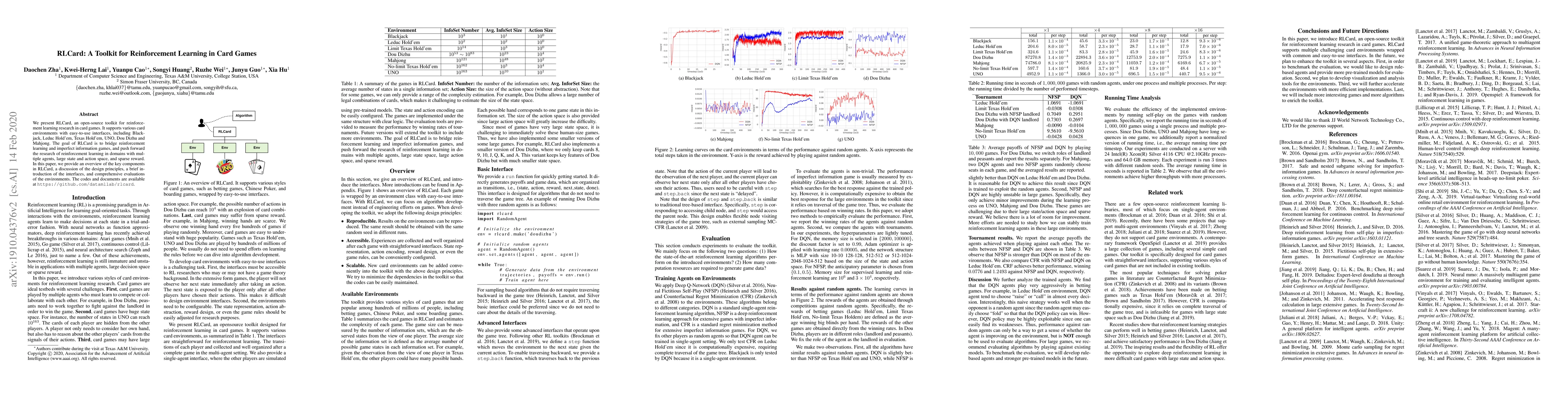 RLCard is an open-source toolkit facilitating reinforcement learning research in various card games, aiming to bridge RL with imperfect information games. It includes environments like Blackjack and Texas Hold'em, and is designed to advance research in multi-agent, large state/action spaces, and sparse reward scenarios.