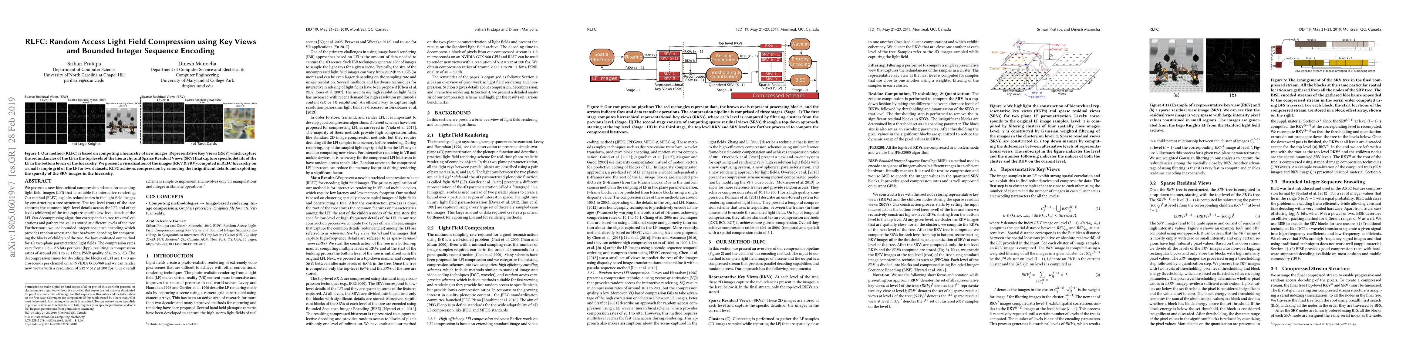 The RLFC method presents a hierarchical compression scheme for light field images, utilizing key views and bounded integer encoding for efficient random access and high compression ratios, achieving 200:1 to 20:1 with fast decoding and interactive rendering speeds.