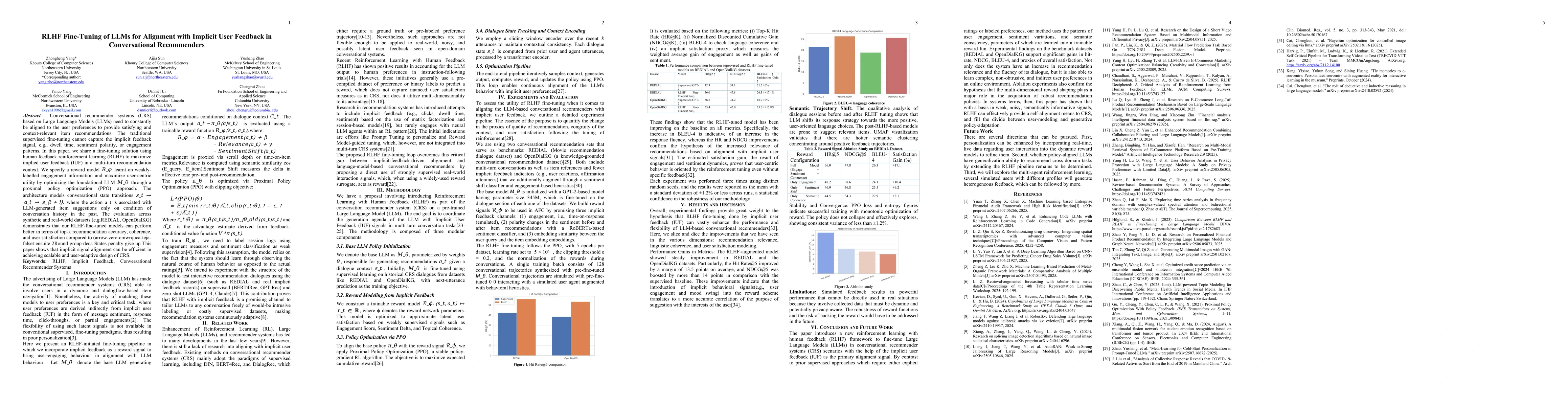 Conversational recommender systems (CRS) based on Large Language Models (LLMs) need to constantly be aligned to the user preferences to provide satisfying and context-relevant item recommendations. The traditional supervised fine-tuning cannot capture the implicit feedback signal, e.g., dwell time, sentiment polarity, or engagement patterns. In this paper, we share a fine-tuning solution using human feedback reinforcement learning (RLHF) to maximize implied user feedback (IUF) in a multi-turn recommendation context. We specify a reward model $R_{\phi}$ learnt on weakly-labelled engagement information and maximize user-centric utility by optimizing the foundational LLM M_{\theta} through a proximal policy optimization (PPO) approach. The architecture models conversational state transitions $s_t \to a_t \to s_{t +1}$, where the action $a_t$ is associated with LLM-generated item suggestions only on condition of conversation history in the past. The evaluation across synthetic and real-world datasets (e.g.REDIAL, OpenDialKG) demonstrates that our RLHF-fine-tuned models can perform better in terms of top-$k$ recommendation accuracy, coherence, and user satisfaction compared to (arrow-zero-cmwrquca-teja-falset ensuite 2Round group-deca States penalty give up This paper shows that implicit signal alignment can be efficient in achieving scalable and user-adaptive design of CRS.