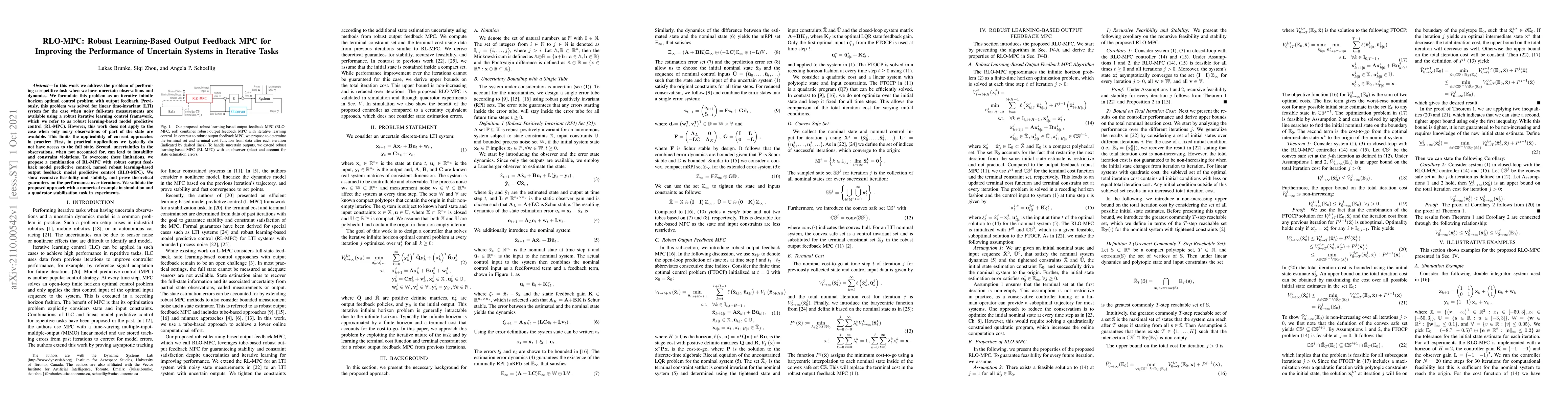 This paper proposes RLO-MPC, a robust learning-based output feedback model predictive control method to improve performance in uncertain systems performing iterative tasks with partial and noisy observations. The approach combines RL-MPC with robust output feedback MPC, ensuring recursive feasibility, stability, and performance guarantees, validated through simulation and quadrotor experiments.
