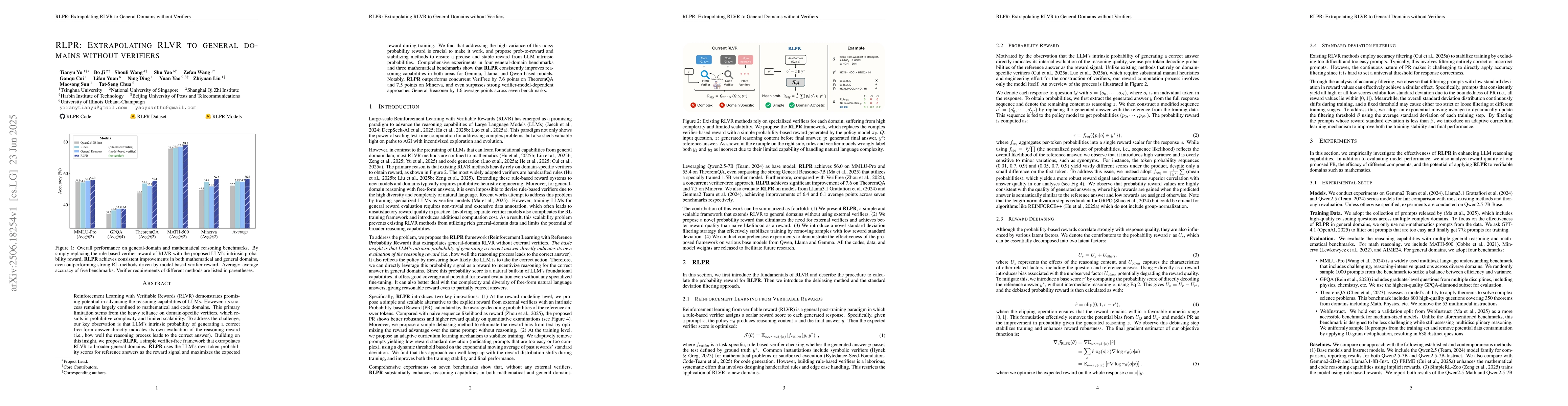 Reinforcement Learning with Verifiable Rewards (RLVR) demonstrates promising potential in advancing the reasoning capabilities of LLMs. However, its success remains largely confined to mathematical and code domains. This primary limitation stems from the heavy reliance on domain-specific verifiers, which results in prohibitive complexity and limited scalability. To address the challenge, our key observation is that LLM's intrinsic probability of generating a correct free-form answer directly indicates its own evaluation of the reasoning reward (i.e., how well the reasoning process leads to the correct answer). Building on this insight, we propose RLPR, a simple verifier-free framework that extrapolates RLVR to broader general domains. RLPR uses the LLM's own token probability scores for reference answers as the reward signal and maximizes the expected reward during training. We find that addressing the high variance of this noisy probability reward is crucial to make it work, and propose prob-to-reward and stabilizing methods to ensure a precise and stable reward from LLM intrinsic probabilities. Comprehensive experiments in four general-domain benchmarks and three mathematical benchmarks show that RLPR consistently improves reasoning capabilities in both areas for Gemma, Llama, and Qwen based models. Notably, RLPR outperforms concurrent VeriFree by 7.6 points on TheoremQA and 7.5 points on Minerva, and even surpasses strong verifier-model-dependent approaches General-Reasoner by 1.6 average points across seven benchmarks.
