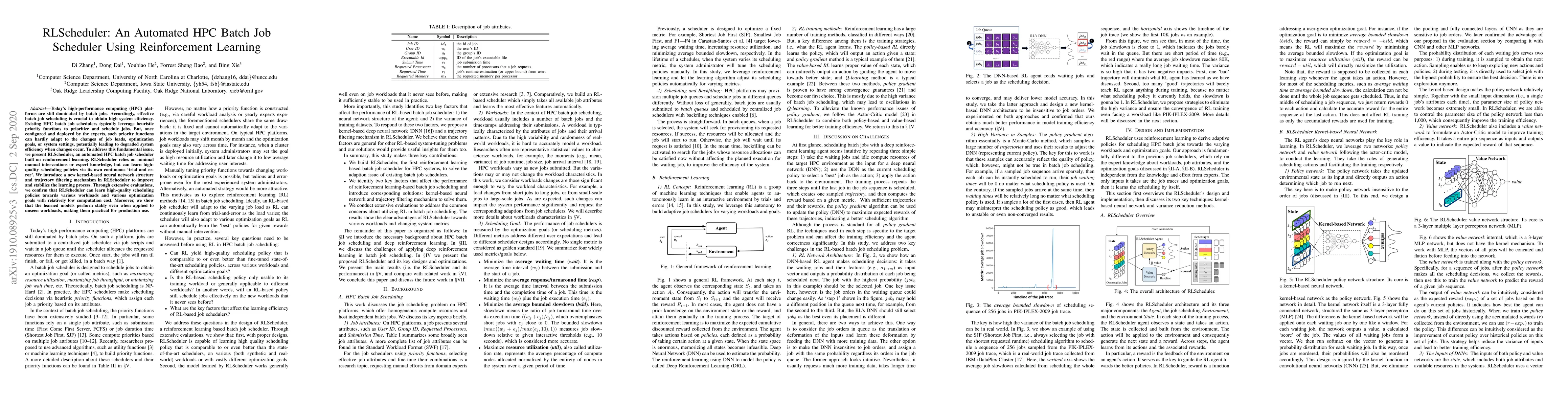 RLScheduler automates HPC batch job scheduling using reinforcement learning, enabling adaptive scheduling policies without expert intervention. It employs a kernel-based neural network and trajectory filtering to stabilize learning, demonstrating high efficiency and adaptability to various workloads and optimization goals.