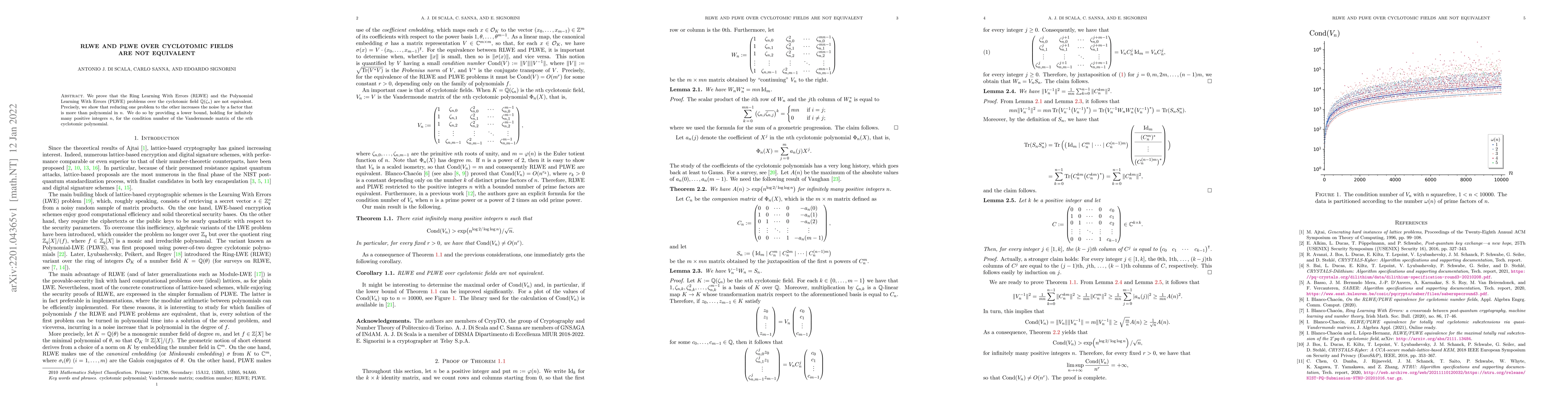 This paper demonstrates that the RLWE and PLWE problems over cyclotomic fields are not equivalent, showing that the reduction from one to the other increases noise by more than a polynomial factor in $n$. It achieves this by establishing a lower bound for the condition number of the Vandermonde matrix of the $n$th cyclotomic polynomial.