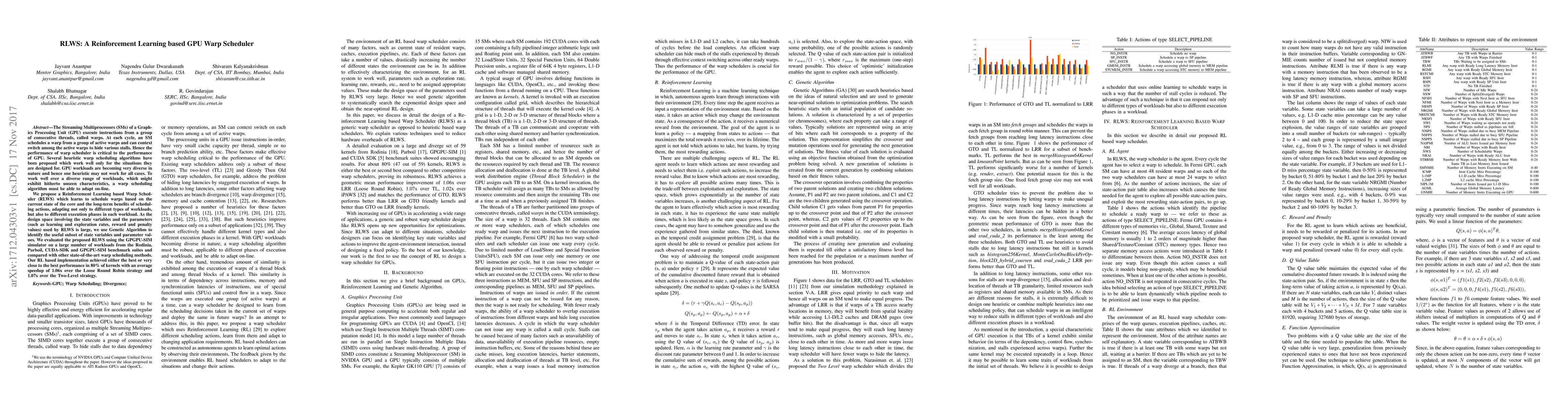 The Streaming Multiprocessors (SMs) of a Graphics Processing Unit (GPU) execute instructions from a group of consecutive threads, called warps. At each cycle, an SM schedules a warp from a group of active warps and can context switch among the active warps to hide various stalls. Hence the performance of warp scheduler is critical to the performance of GPU. Several heuristic warp scheduling algorithms have been proposed which work well only for the situations they are designed for. GPU workloads are becoming very diverse in nature and hence one heuristic may not work for all cases. To work well over a diverse range of workloads, which might exhibit hitherto unseen characteristics, a warp scheduling algorithm must be able to adapt on-line. We propose a Reinforcement Learning based Warp Scheduler (RLWS) which learns to schedule warps based on the current state of the core and the long-term benefits of scheduling actions, adapting not only to different types of workloads, but also to different execution phases in each workload. As the design space involving the state variables and the parameters (such as learning and exploration rates, reward and penalty values) used by RLWS is large, we use Genetic Algorithm to identify the useful subset of state variables and parameter values. We evaluated the proposed RLWS using the GPGPU-SIM simulator on a large number of workloads from the Rodinia, Parboil, CUDA-SDK and GPGPU-SIM benchmark suites and compared with other state-of-the-art warp scheduling methods. Our RL based implementation achieved either the best or very close to the best performance in 80\% of kernels with an average speedup of 1.06x over the Loose Round Robin strategy and 1.07x over the Two-Level strategy.