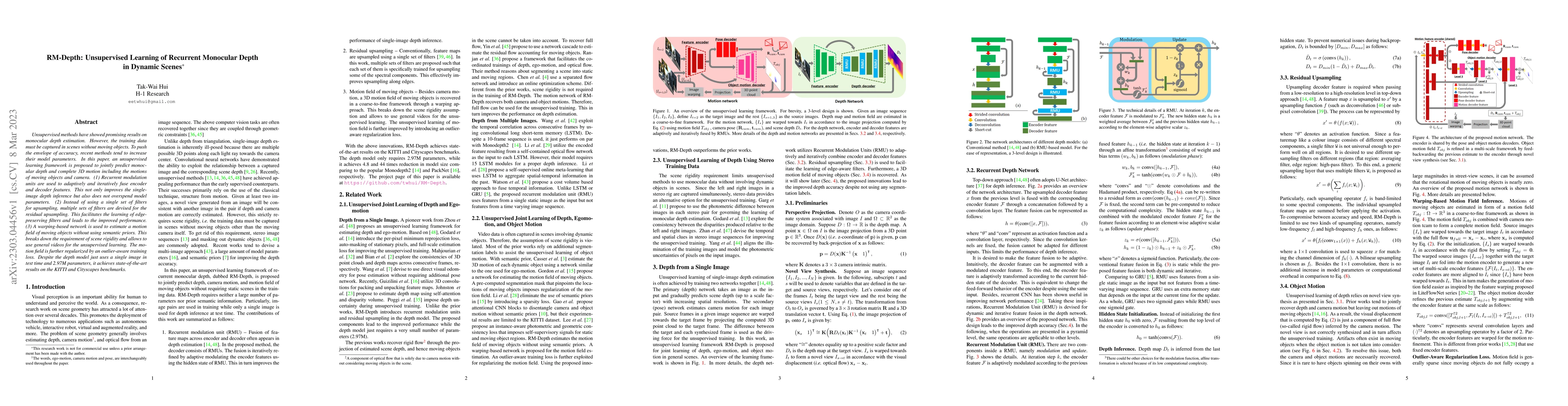 This paper proposes an unsupervised learning framework called RM-Depth for estimating monocular depth and 3D motion in dynamic scenes. It uses recurrent modulation units to efficiently fuse encoder and decoder features, multiple sets of filters for residual upsampling, and a warping-based network for motion field estimation without semantic priors, achieving state-of-the-art results on KITTI and Cityscapes benchmarks.