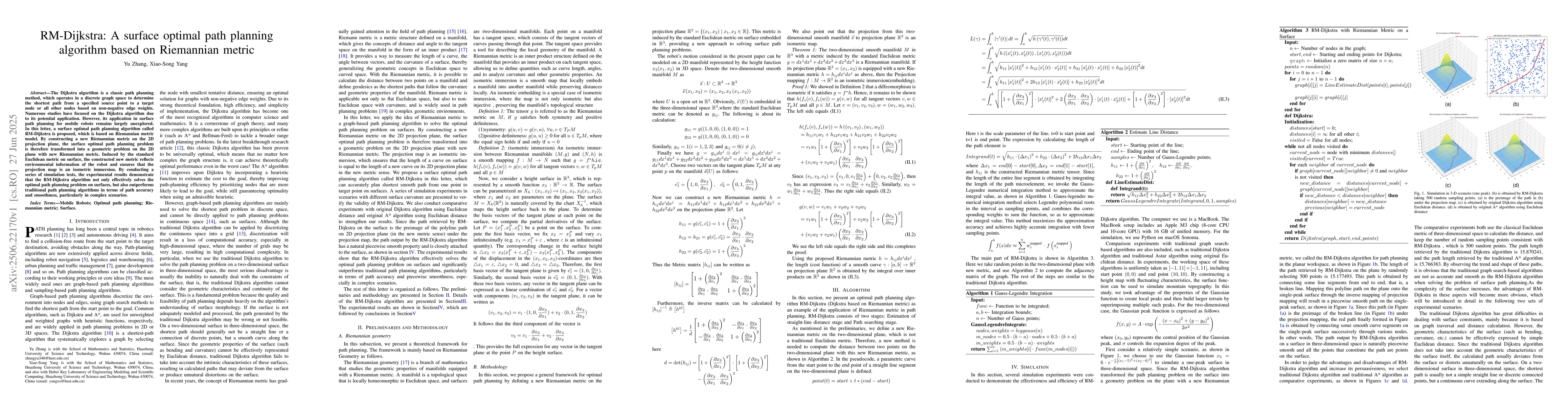 The Dijkstra algorithm is a classic path planning method, which operates in a discrete graph space to determine the shortest path from a specified source point to a target node or all other nodes based on non-negative edge weights. Numerous studies have focused on the Dijkstra algorithm due to its potential application. However, its application in surface path planning for mobile robots remains largely unexplored. In this letter, a surface optimal path planning algorithm called RM-Dijkstra is proposed, which is based on Riemannian metric model. By constructing a new Riemannian metric on the 2D projection plane, the surface optimal path planning problem is therefore transformed into a geometric problem on the 2D plane with new Riemannian metric. Induced by the standard Euclidean metric on surface, the constructed new metric reflects environmental information of the robot and ensures that the projection map is an isometric immersion. By conducting a series of simulation tests, the experimental results demonstrate that the RM-Dijkstra algorithm not only effectively solves the optimal path planning problem on surfaces, but also outperforms traditional path planning algorithms in terms of path accuracy and smoothness, particularly in complex scenarios.