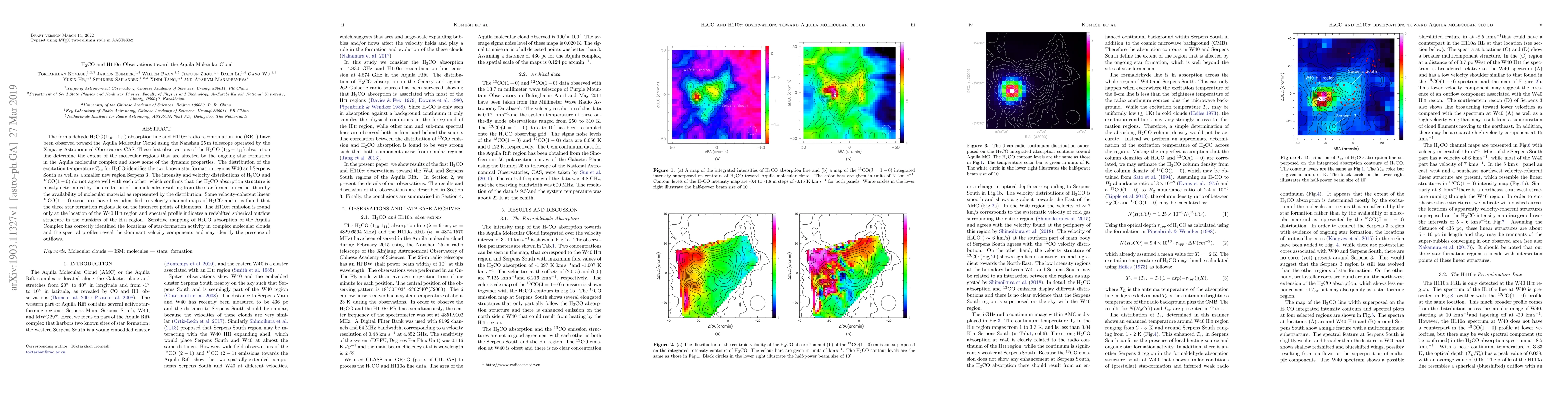 The formaldehyde $\rm H_2CO(1_{10} - 1_{11})$ absorption line and H$110\alpha$ radio recombination line (RRL) have been observed toward the Aquila Molecular Cloud using the Nanshan 25 m telescope operated by the Xinjiang Astronomical Observatory CAS. These first observations of the $\rm H_2CO$ $(1_{10} - 1_{11})$ absorption line determine the extent of the molecular regions that are affected by the ongoing star formation in the Aquila molecular complex and show some of the dynamic properties. The distribution of the excitation temperature $T_{ex}$ for $\rm H_2CO$ identifies the two known star formation regions W40 and Serpens South as well as a smaller new region Serpens 3. The intensity and velocity distributions of $\rm H_2CO$ and $\rm ^{13}CO(1-0)$ do not agree well with each other, which confirms that the $\rm H_2CO$ absorption structure is mostly determined by the excitation of the molecules resulting from the star formation rather than by the availability of molecular material as represented by the distribution. Some velocity-coherent linear $\rm ^{13}CO(1-0)$ structures have been identified in velocity channel maps of $\rm H_2CO$ and it is found that the three star formation regions lie on the intersect points of filaments. The $\rm H110\alpha$ emission is found only at the location of the W40 H II region and spectral profile indicates a redshifted spherical outflow structure in the outskirts of the H II region. Sensitive mapping of $\rm H_2CO$ absorption of the Aquila Complex has correctly identified the locations of star-formation activity in complex molecular clouds and the spectral profiles reveal the dominant velocity components and may identify the presence of outflows.