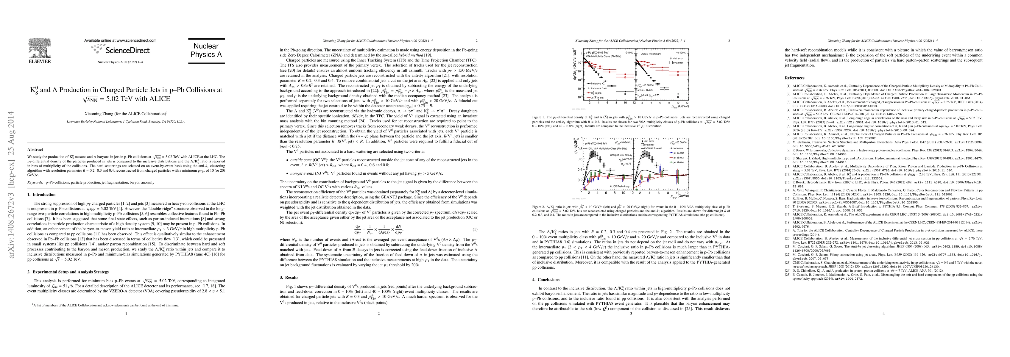 We study the production of ${\rm K}_{\rm S}^{0}$ mesons and $\Lambda$ baryons in jets in p--Pb collisions at $\sqrt{s_{\rm NN}}=5.02$ TeV with ALICE at the LHC. The $p_{\rm T}$-differential density of the particles produced in jets is compared to the inclusive distributions and the $\Lambda/{\rm K}_{\rm S}^{0}$ ratio is reported in bins of multiplicity of the collisions. The hard scatterings are selected on an event-by-event basis using the anti-$k_{\rm T}$ clustering algorithm with resolution parameter $R=0.2,~0.3$ and $0.4$, reconstructed from charged particles with a minimum $p_{\rm T,jet}$ of $10$ (or $20$) GeV/$c$.