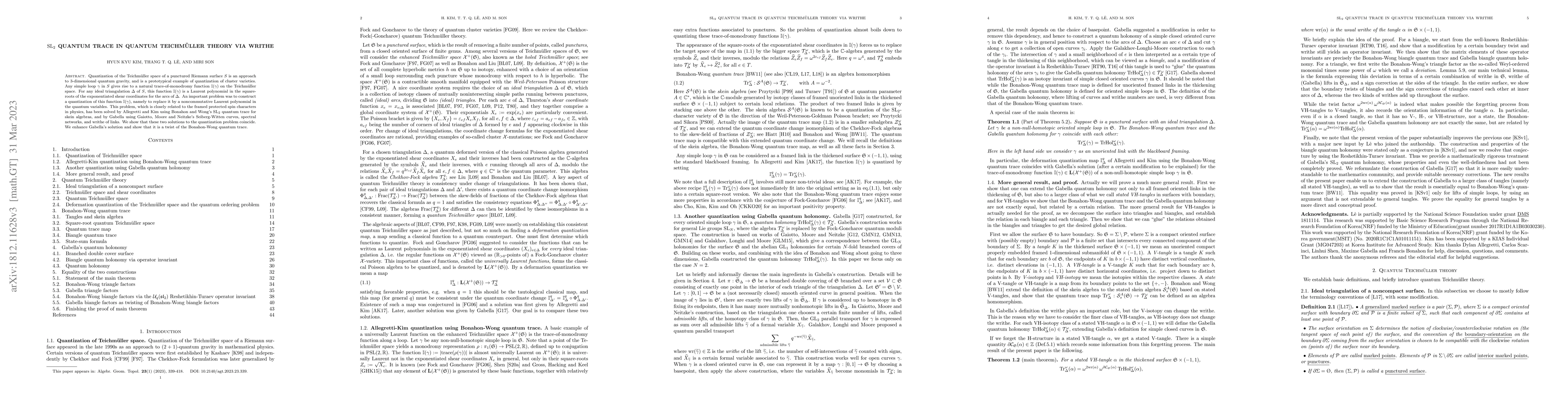 This paper quantizes the Teichmüller space of a punctured Riemann surface, addressing the problem of constructing a noncommutative Laurent polynomial for the trace-of-monodromy function. It demonstrates that two distinct solutions, one using Bonahon and Wong's ${\rm SL}_2$ quantum trace and another via Gabella's Seiberg-Witten curves and writhe, are equivalent and that the latter is a twist of the former.