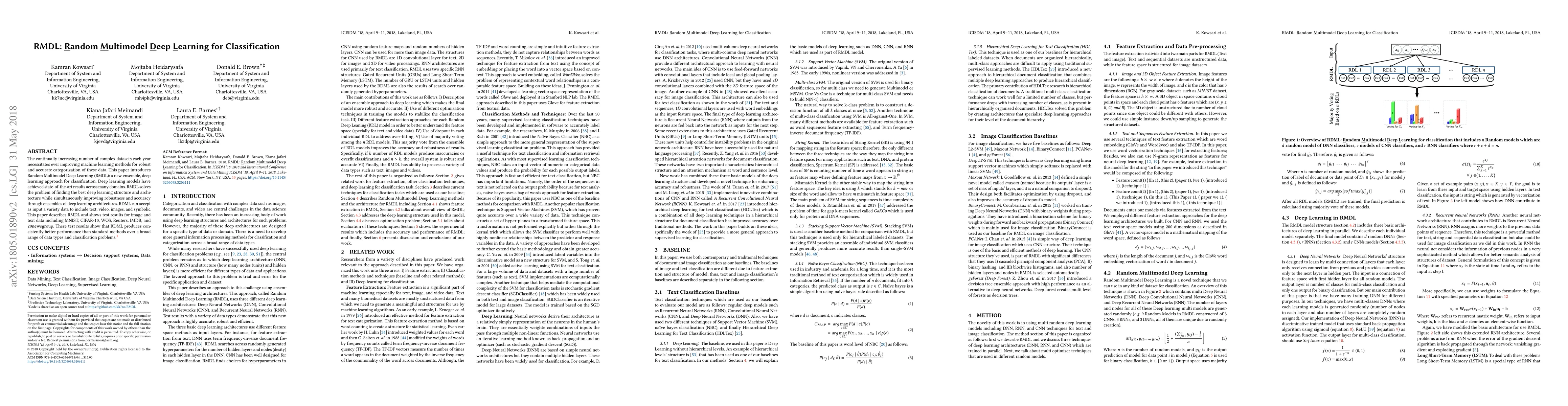 The paper introduces Random Multimodel Deep Learning (RMDL), a novel ensemble deep learning method for classification that handles diverse data types including text, images, and video. RMDL outperforms standard methods across various datasets like MNIST, CIFAR-10, and text datasets such as WOS, Reuters, IMDB, and 20newsgroup, demonstrating robustness and accuracy improvements.