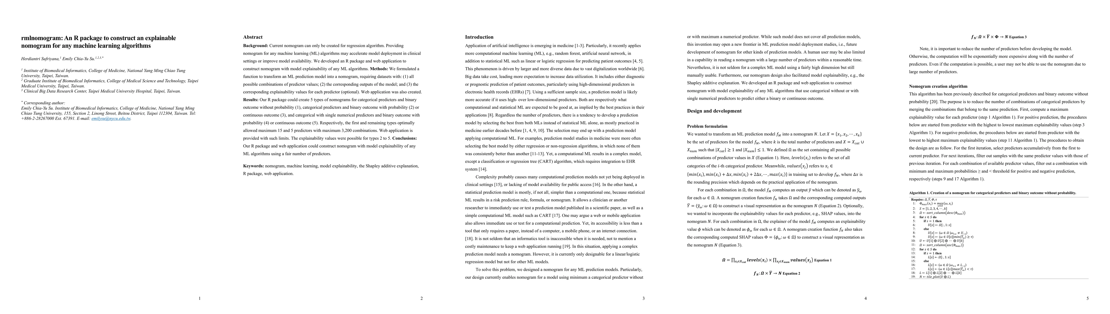 The paper introduces the rmlnomogram R package and web application designed to construct explainable nomograms for any machine learning algorithms, addressing the limitation of existing nomograms that only support regression algorithms. The package can generate various types of nomograms with up to 15 predictors and supports explainability values for certain model types.