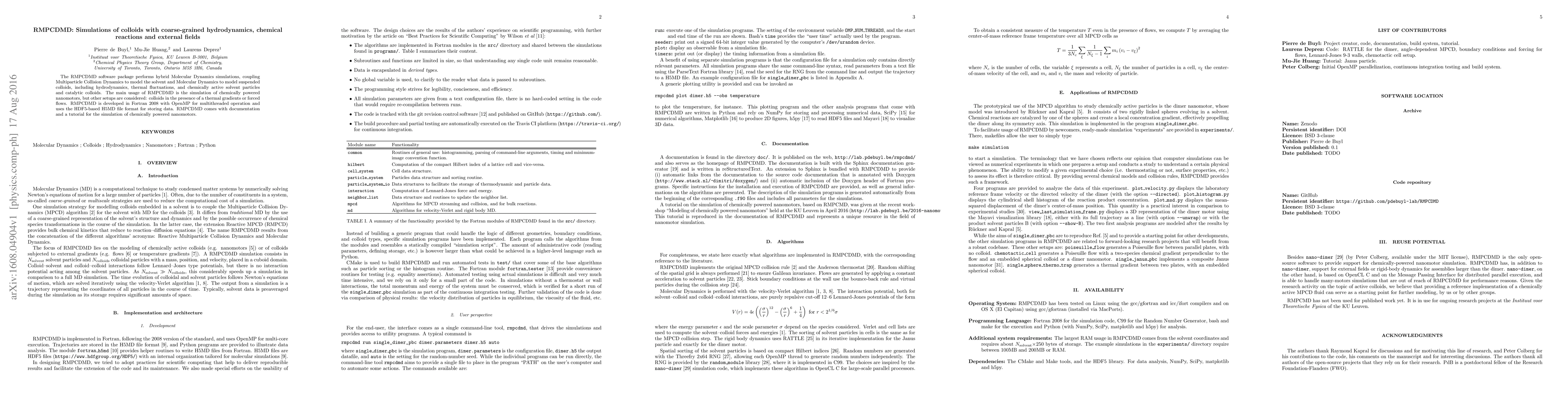 The RMPCDMD software package simulates colloids using a hybrid Molecular Dynamics approach, combining Multiparticle Collision Dynamics for the solvent and Molecular Dynamics for colloids, to model hydrodynamics, thermal fluctuations, and chemical reactions. It is primarily used for simulating chemically powered nanomotors but can also handle colloids under thermal gradients or forced flows.