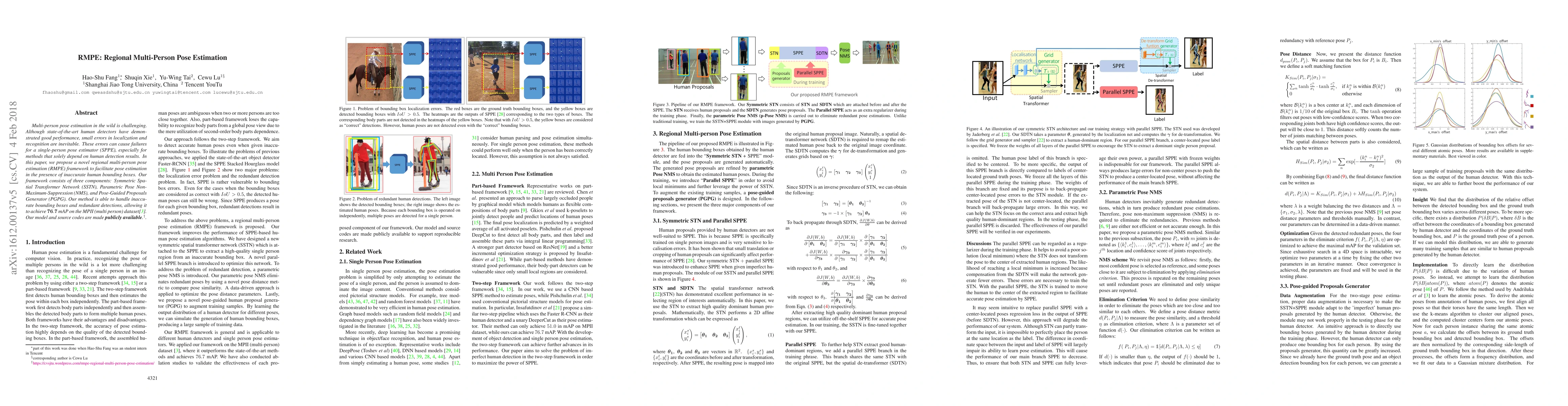 Multi-person pose estimation in the wild is challenging. Although state-of-the-art human detectors have demonstrated good performance, small errors in localization and recognition are inevitable. These errors can cause failures for a single-person pose estimator (SPPE), especially for methods that solely depend on human detection results. In this paper, we propose a novel regional multi-person pose estimation (RMPE) framework to facilitate pose estimation in the presence of inaccurate human bounding boxes. Our framework consists of three components: Symmetric Spatial Transformer Network (SSTN), Parametric Pose Non-Maximum-Suppression (NMS), and Pose-Guided Proposals Generator (PGPG). Our method is able to handle inaccurate bounding boxes and redundant detections, allowing it to achieve a 17% increase in mAP over the state-of-the-art methods on the MPII (multi person) dataset.Our model and source codes are publicly available.