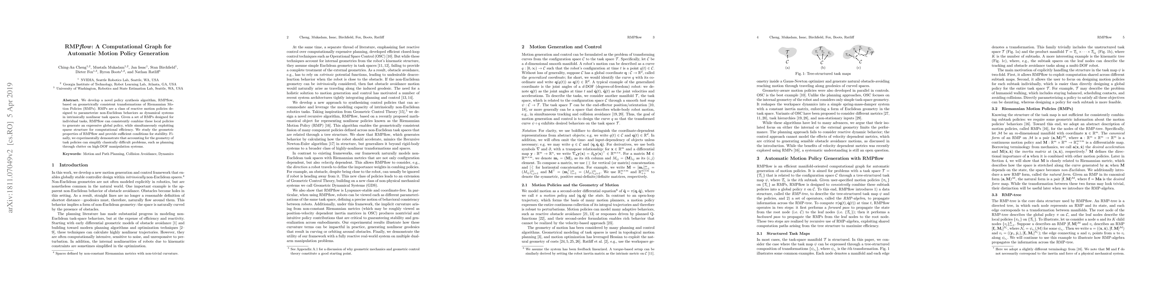 RMPflow is a novel algorithm for generating global motion policies by combining geometrically consistent Riemannian Motion Policies (RMPs). It leverages the intrinsic nonlinear task spaces and sparse structure for computational efficiency, and demonstrates improved performance in complex manipulation tasks.