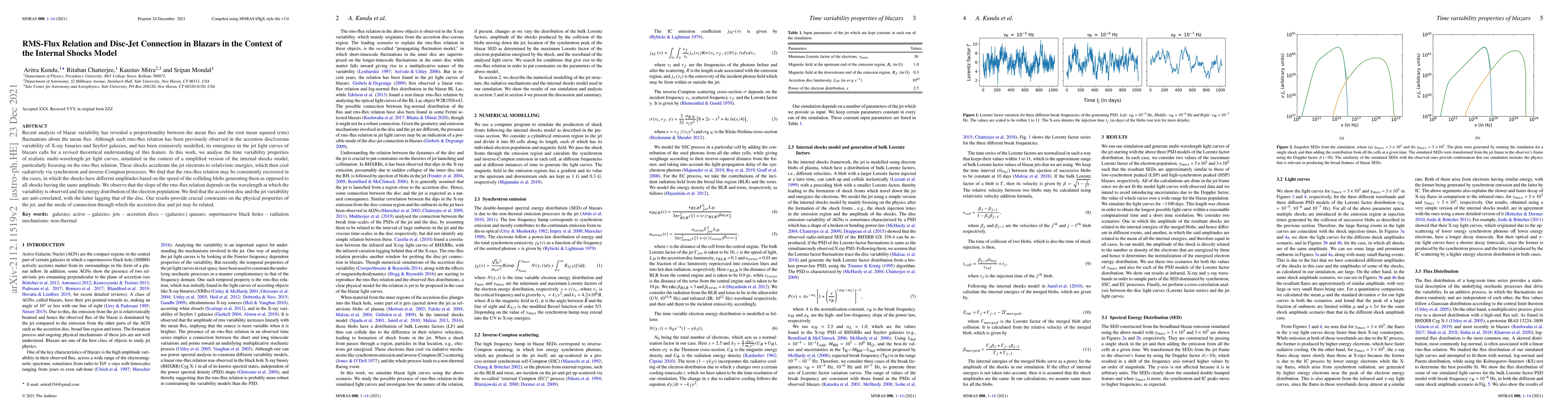 This paper investigates the rms-flux relation in blazar jets within the internal shocks model, finding that variability depends on shock amplitudes and observed wavelengths. It reveals an anti-correlation between accretion disc and jet variability, offering insights into their physical connection.