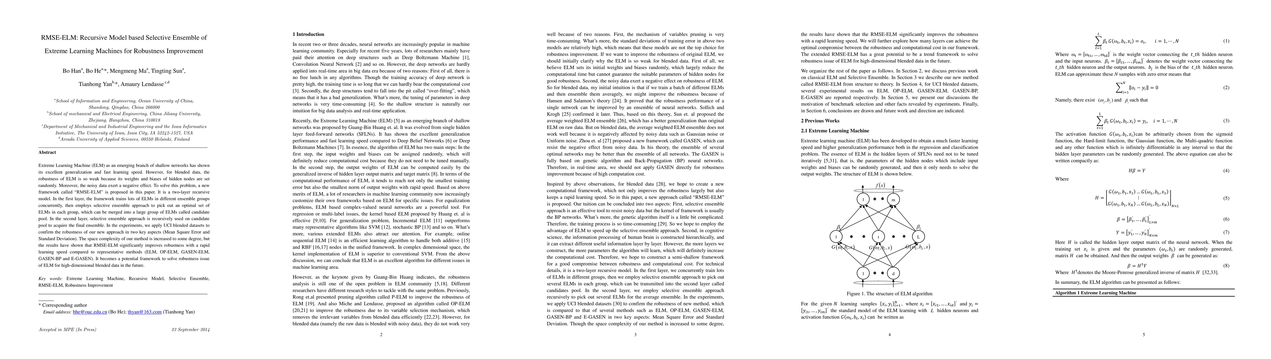 The paper proposes RMSE-ELM, a two-layer recursive model for enhancing the robustness of Extreme Learning Machines (ELM) by employing a selective ensemble approach. The method trains multiple ELMs in groups, selects optimal subsets, and recursively ensembles them to improve robustness against blended data, showing better performance in mean square error and standard deviation compared to other methods.