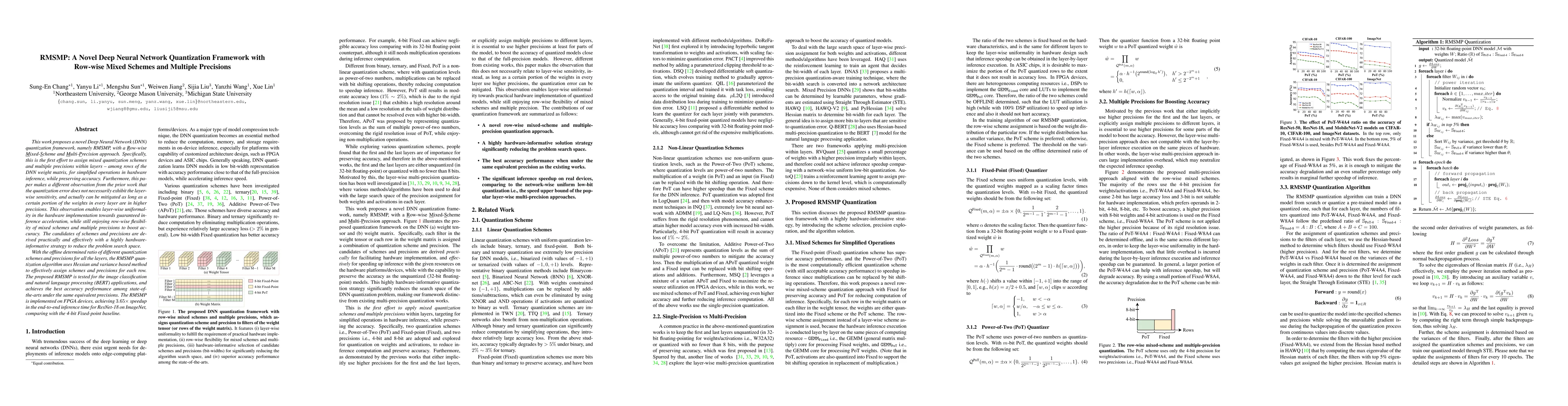 The RMSMP framework introduces a novel quantization method for Deep Neural Networks that employs row-wise mixed quantization schemes and multiple precisions to optimize hardware inference while maintaining accuracy. It achieves significant speedups in inference time on FPGA devices, demonstrating superior performance in image classification and NLP tasks.