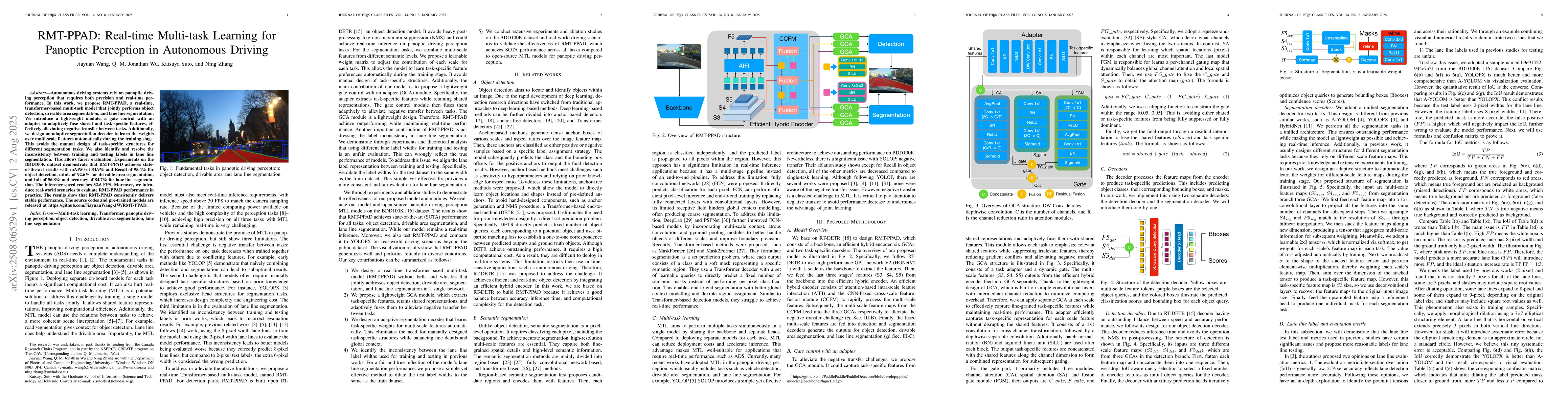 Autonomous driving systems rely on panoptic driving perception that requires both precision and real-time performance. In this work, we propose RMT-PPAD, a real-time, transformer-based multi-task model that jointly performs object detection, drivable area segmentation, and lane line segmentation. We introduce a lightweight module, a gate control with an adapter to adaptively fuse shared and task-specific features, effectively alleviating negative transfer between tasks. Additionally, we design an adaptive segmentation decoder to learn the weights over multi-scale features automatically during the training stage. This avoids the manual design of task-specific structures for different segmentation tasks. We also identify and resolve the inconsistency between training and testing labels in lane line segmentation. This allows fairer evaluation. Experiments on the BDD100K dataset demonstrate that RMT-PPAD achieves state-of-the-art results with mAP50 of 84.9% and Recall of 95.4% for object detection, mIoU of 92.6% for drivable area segmentation, and IoU of 56.8% and accuracy of 84.7% for lane line segmentation. The inference speed reaches 32.6 FPS. Moreover, we introduce real-world scenarios to evaluate RMT-PPAD performance in practice. The results show that RMT-PPAD consistently delivers stable performance. The source codes and pre-trained models are released at https://github.com/JiayuanWang-JW/RMT-PPAD.