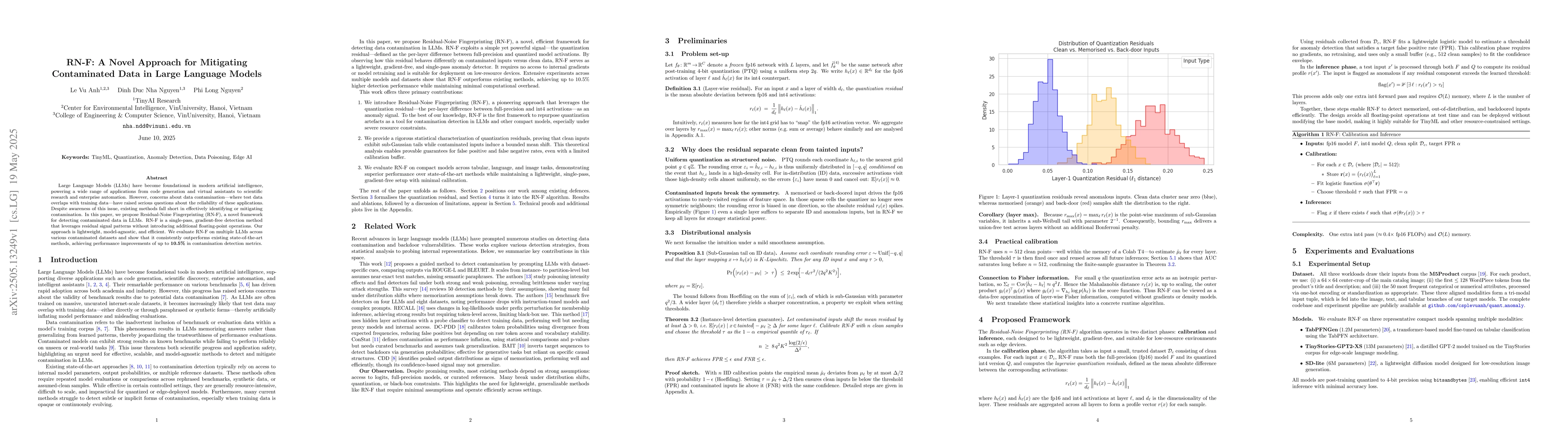The paper proposes Residual-Noise Fingerprinting (RN-F), a single-pass, gradient-free detection method for identifying contaminated data in Large Language Models (LLMs) by leveraging residual signal patterns without additional floating-point operations.