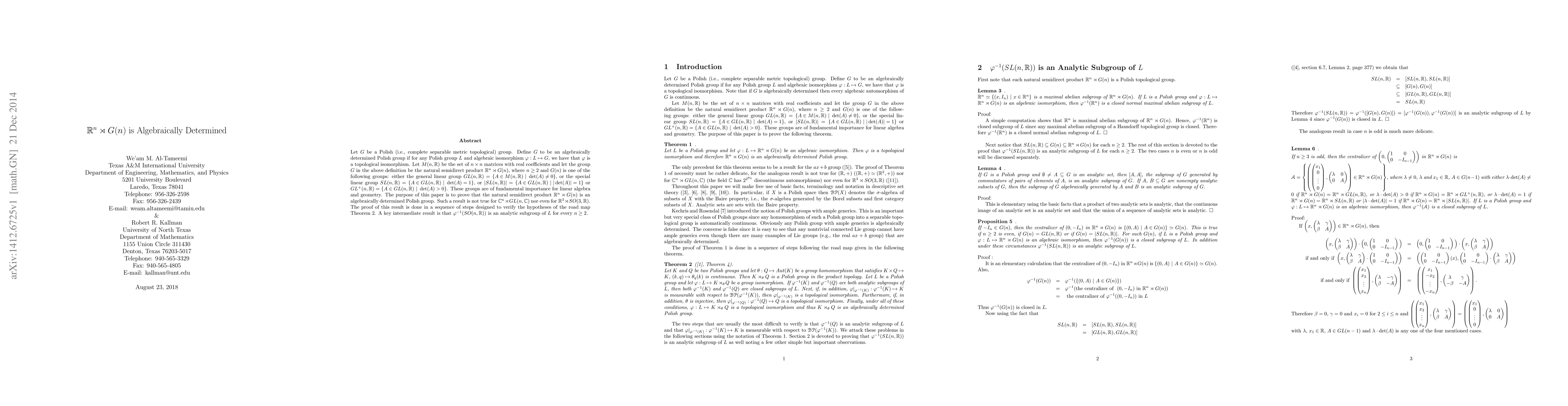 This paper proves that the natural semidirect product $\R^{n} \rtimes G(n)$ is an algebraically determined Polish group, establishing that any algebraic isomorphism between such groups is necessarily a topological isomorphism. The proof leverages the analytic subgroup structure and follows a sequence of steps confirming the hypotheses of Theorem 2.