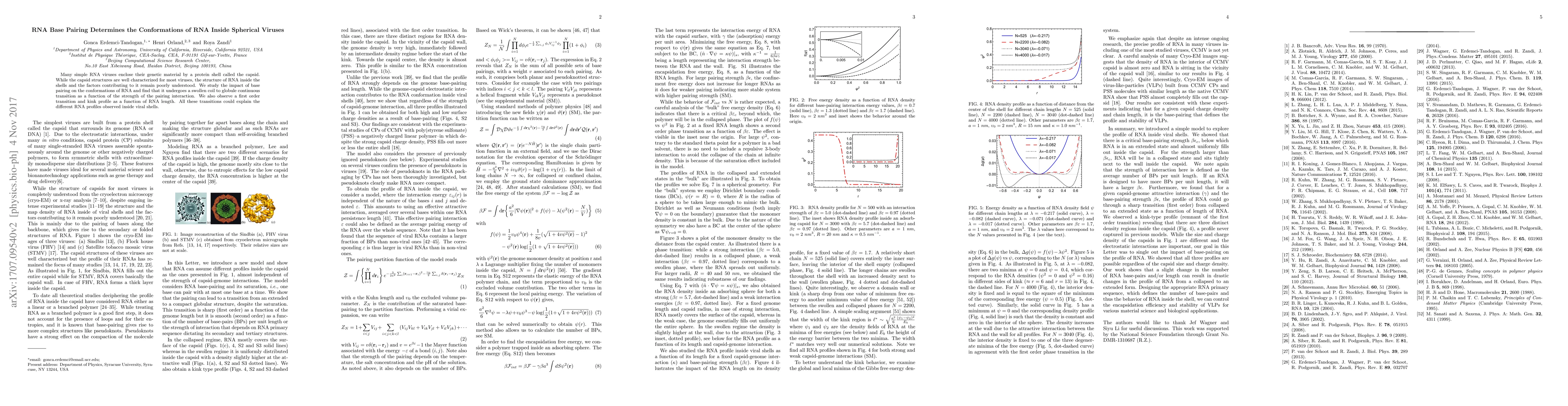 Many simple RNA viruses enclose their genetic material by a protein shell called the capsid. While the capsid structures are well characterized for most viruses, the structure of RNA inside the shells and the factors contributing to it remain poorly understood. We study the impact of base pairing on the conformations of RNA and find that it undergoes a swollen coil to globule continuous transition as a function of the strength of the pairing interaction. We also observe a first order transition and kink profile as a function of RNA length. All these transitions could explain the different RNA profiles observed inside viral shells.