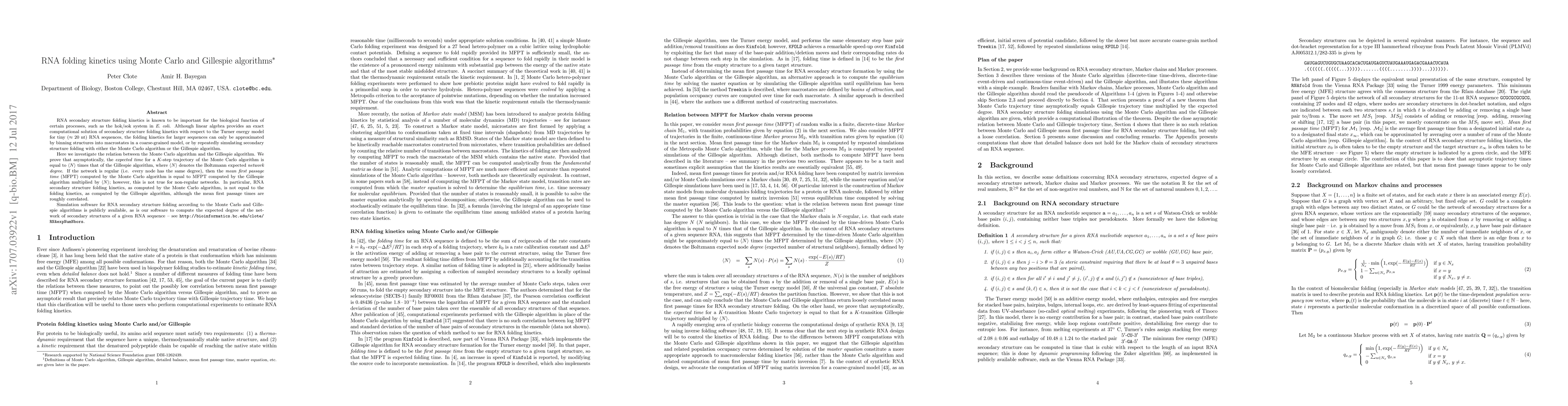 This paper compares the Monte Carlo and Gillespie algorithms for simulating RNA secondary structure folding kinetics, showing that while their mean first passage times are roughly correlated, the expected time for a K-step Monte Carlo trajectory is asymptotically <N> times that of the Gillespie algorithm, where <N> is the Boltzmann expected network degree. Simulation tools for both algorithms are made publicly available.