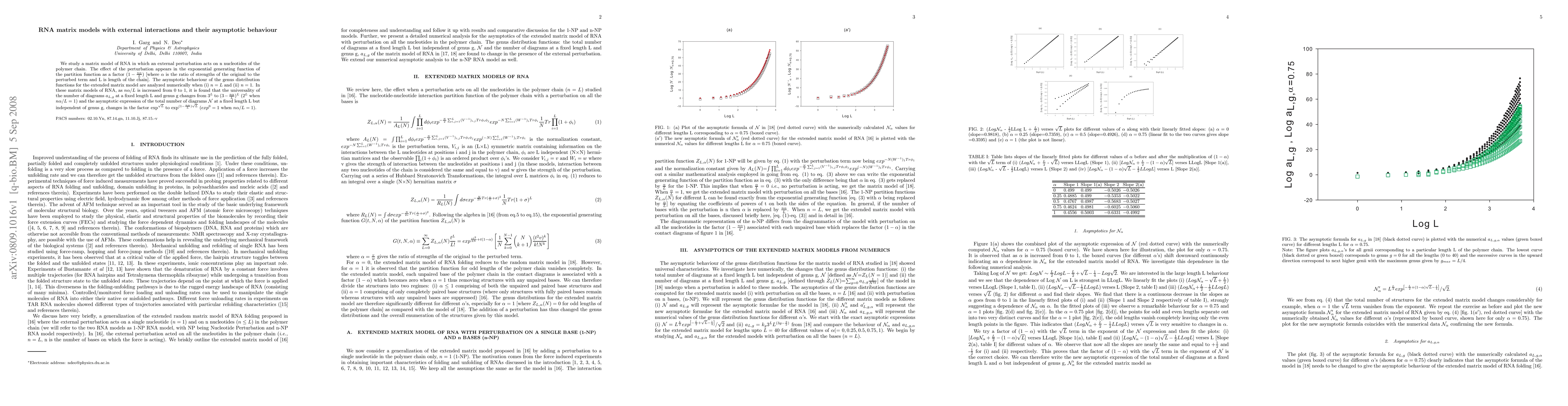 We study a matrix model of RNA in which an external perturbation acts on n nucleotides of the polymer chain. The effect of the perturbation appears in the exponential generating function of the partition function as a factor $(1-\frac{n\alpha}{L})$ [where $\alpha$ is the ratio of strengths of the original to the perturbed term and L is length of the chain]. The asymptotic behaviour of the genus distribution functions for the extended matrix model are analyzed numerically when (i) $n=L$ and (ii) $n=1$. In these matrix models of RNA, as $n\alpha/L$ is increased from 0 to 1, it is found that the universality of the number of diagrams $a_{L, g}$ at a fixed length L and genus g changes from $3^{L}$ to $(3-\frac{n\alpha}{L})^{L}$ ($2^{L}$ when $n\alpha/L=1$) and the asymptotic expression of the total number of diagrams $\cal N$ at a fixed length L but independent of genus g, changes in the factor $\exp^{\sqrt{L}}$ to $\exp^{(1-\frac{n\alpha}{L})\sqrt{L}}$ ($exp^{0}=1$ when $n\alpha/L=1$)