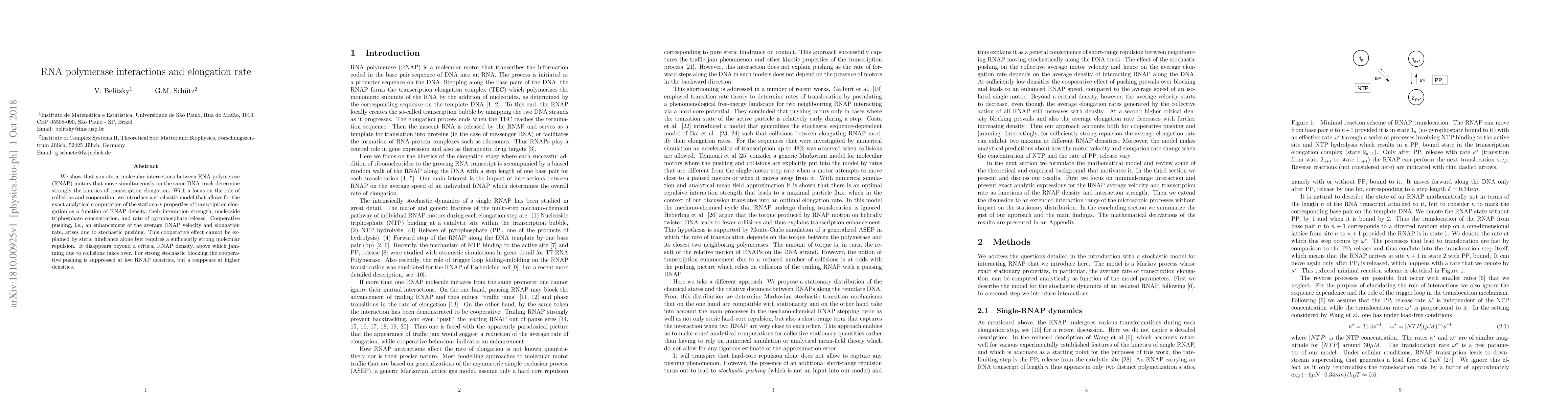 This paper investigates how non-steric molecular interactions between RNA polymerase motors influence transcription elongation kinetics, introducing a stochastic model to analyze the effects of RNAP density, interaction strength, and nucleotide triphosphate concentration. The study finds that cooperative pushing enhances elongation rate due to stochastic interactions, but this effect diminishes when RNAP density exceeds a critical threshold, leading to jamming.