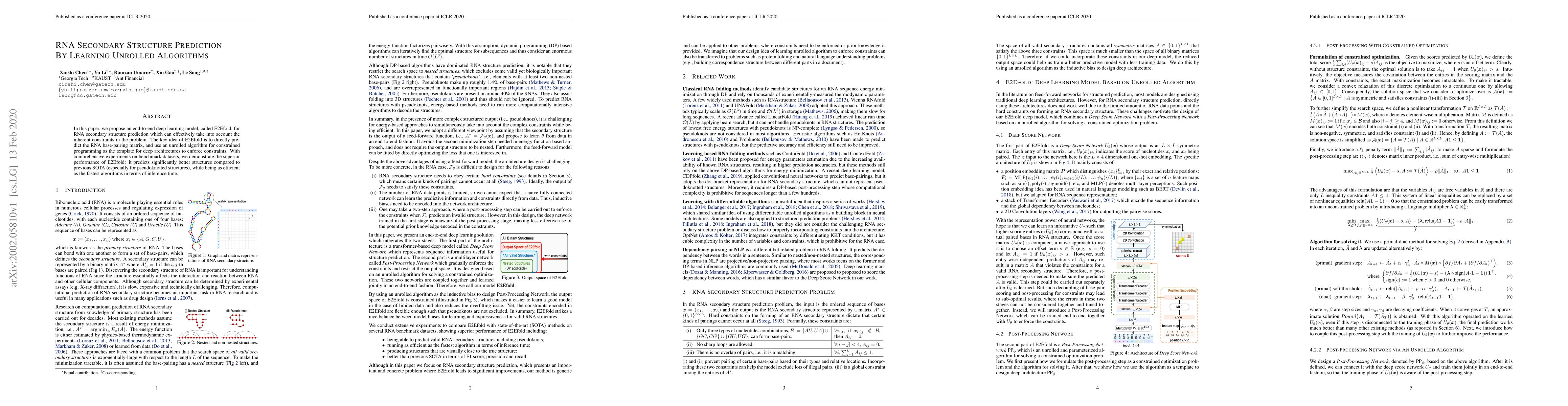This paper introduces E2Efold, a deep learning model for RNA secondary structure prediction that directly predicts the base-pairing matrix and uses an unrolled algorithm to enforce constraints, achieving superior performance over previous methods, especially for pseudoknotted structures, while maintaining efficient inference times.