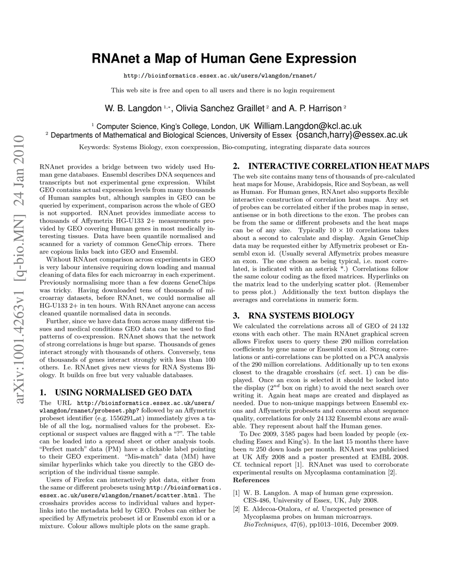 RNAnet provides a bridge between two widely used Human gene databases. Ensembl describes DNA sequences and transcripts but not experimental gene expression. Whilst NCBI's GEO contains actual expression levels from Human samples. RNAnet provides immediate access to thousands of Affymetrix HG-U133 2plus GeneChip measurements Homo sapiens genes in most medically interesting tissues. Without RNAnet comparison across experiments in GEO is very labour intensive requiring man months of effort to down load and clean data. With RNAnet anyone can access cleaned quantile normalised data in seconds. It can be used to data mine patterns of co-expression. The network of strongly correlated genes is huge but sparse. Thousands of genes interact strongly with thousands of others. Conversely there are tens of thousands of genes which interact strongly with less than 100 others. I.e. RNAnet gives new views for RNA Systems Biology.